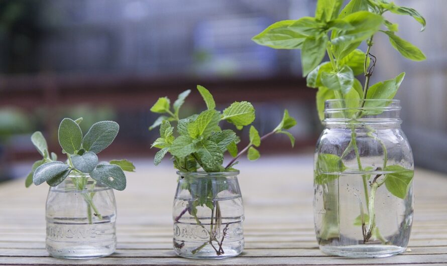 Plantas tales como albahaca, salvia, orégano, tomillo, romero, estragón y menta son ideales para mantener en el agua, siempre en lugares luminosos y con agua limpia y fresca.