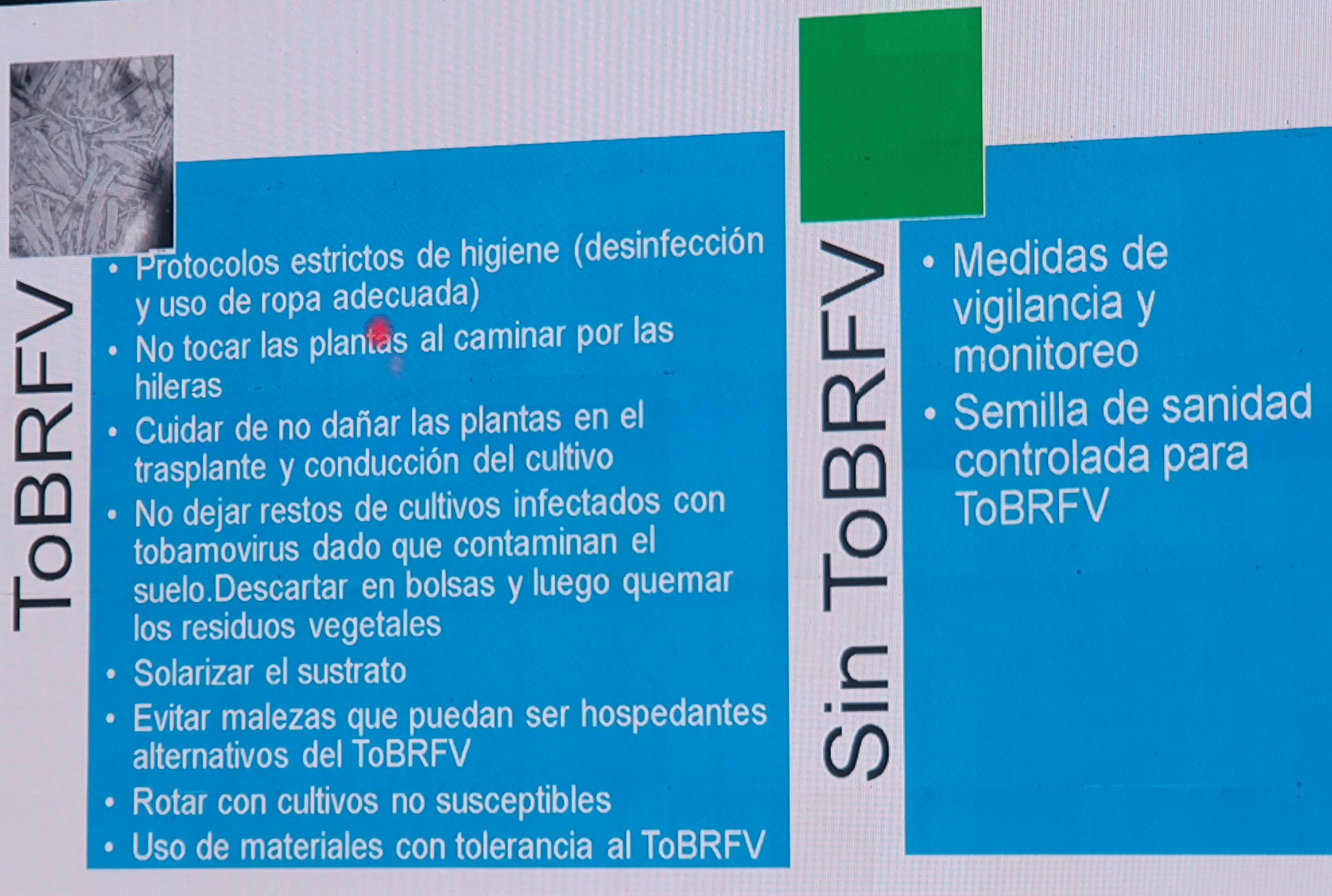 La Dra López Lambertini mencionó que en 2014 aparece en Israel, luego va a Europa, en 2018 llegó a Estados Unidos y México y este año lo encontró la investigadora del Laboratorio de Fitopatología Hortícola del INTA EEA Bella Vista, Ing. Agr. Verónica Obregón, en Argentina. El grave inconveniente es que se transmite por contacto y todo contamina, las plantas, herramientas, la ropa, el suelo, el agua, las manos, etc., pero lo más importante es que ingresa por heridas, necesita un daño o lastimadura para entrar. Se recomienda erradicar la planta infectada, y quemarla; además tomar el sector alrededor y también eliminar.