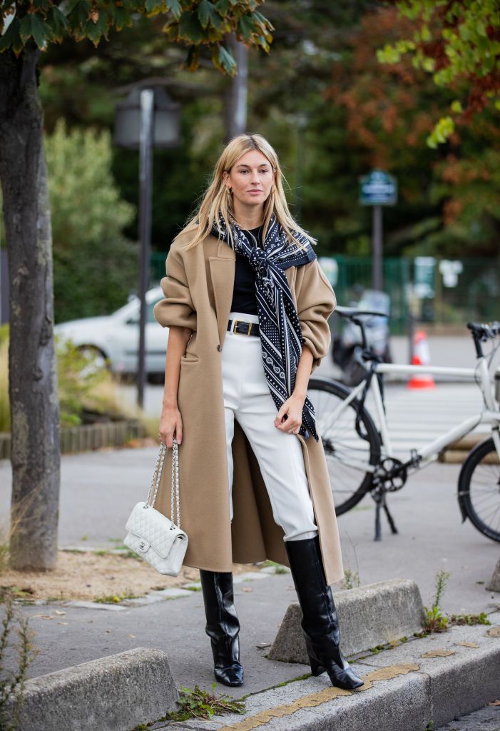 Partiendo una vez más de la perfecta base en blanco, zapatos incluidos, un tapado de paño color camel es la combinación perfecta seguida por botas y cartera de color negro y el detalle del pañuelo son parte de las claves del éxito en una apuesta tan colorida para una temporada tan fría.