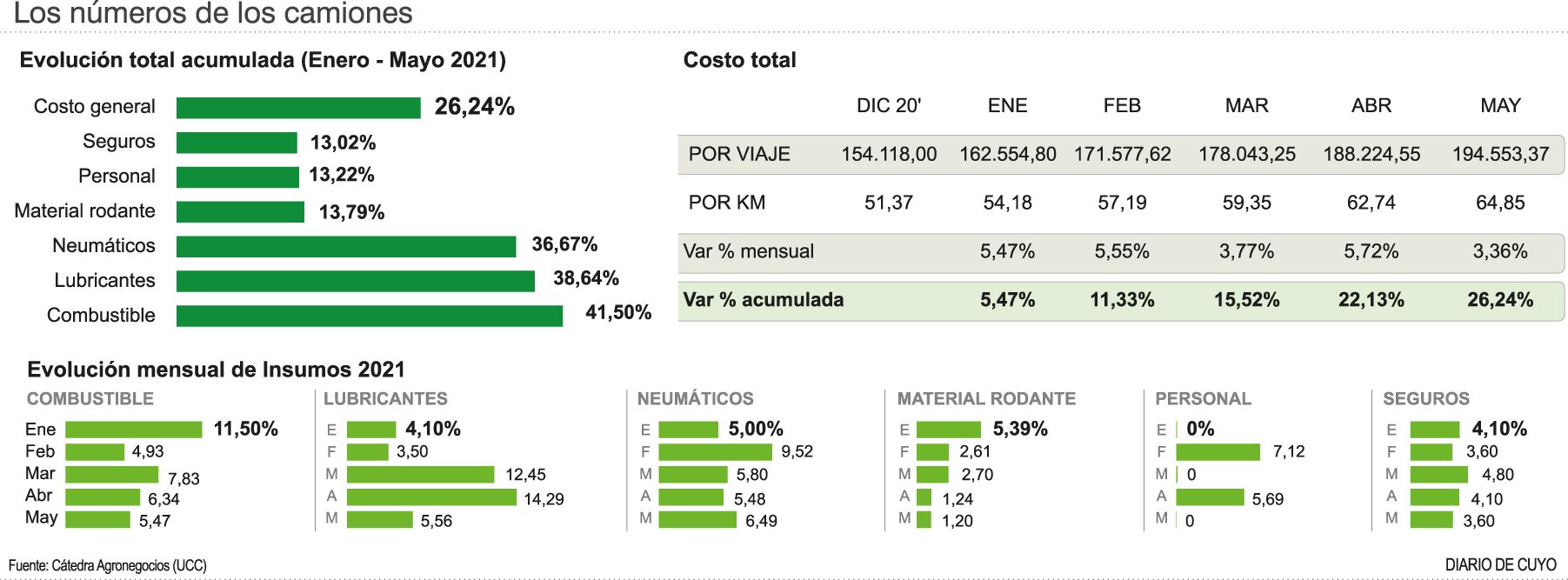 El costo por kilómetro, en pesos, una variable muy utilizada por el sector de los camioneros, más práctica y simple, era de 54,18 en enero; 57,19 en febrero; 59,35 en marzo; 62,74 en abril y llegó a 64,85 pesos en mayo de 2021.