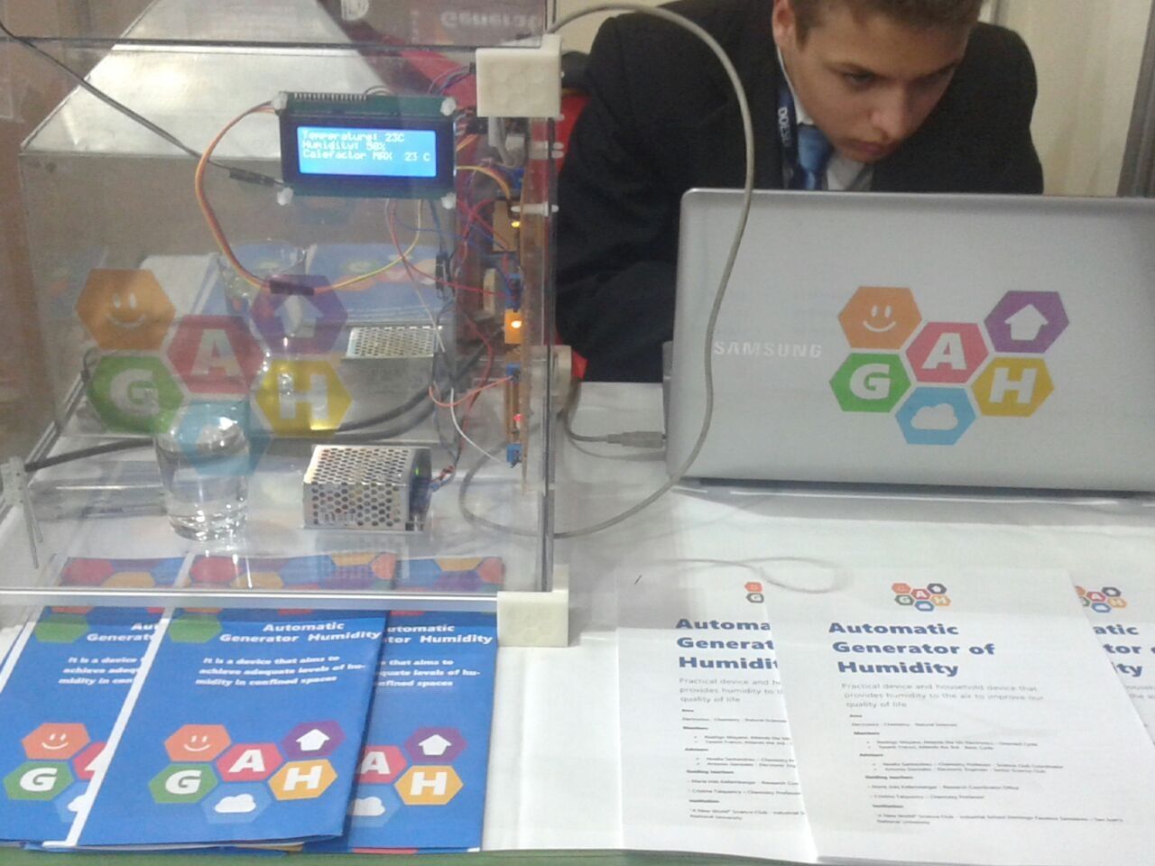 "El Generador Automático de Humedad, para nosotros GAH, está compuesto por una cuba que se calienta eléctricamente y tiene determinados sensores, el principal es el de humedad que permite determinar qué nivel de humedad tenemos en el ambiente en cada momento. Ese sensor realimenta al sistema y le indica a la central electrónica si debe calentar o no agua para llegar al nivel del vapor. En el caso de San Juan no hace falta que llegue a hervir, a los 75-80 grados empieza a generarse vapor y por ende humedad. Como debe permanecer conectado para que funcione, sólo se activa cuando el sistema capta que falta humedad. Si se excede del nivel pretendido directamente deja de generar calor para a su vez dejar de generar vapor. Y si pasa lo contrario, calefacciona para generar el vapor suficiente”, explican los estudiantes sobre un producto que está pensado para estar instalado en un ambiente cerrado, conectado a la red eléctrica, con un consumo similar al de otros electrodomésticos.