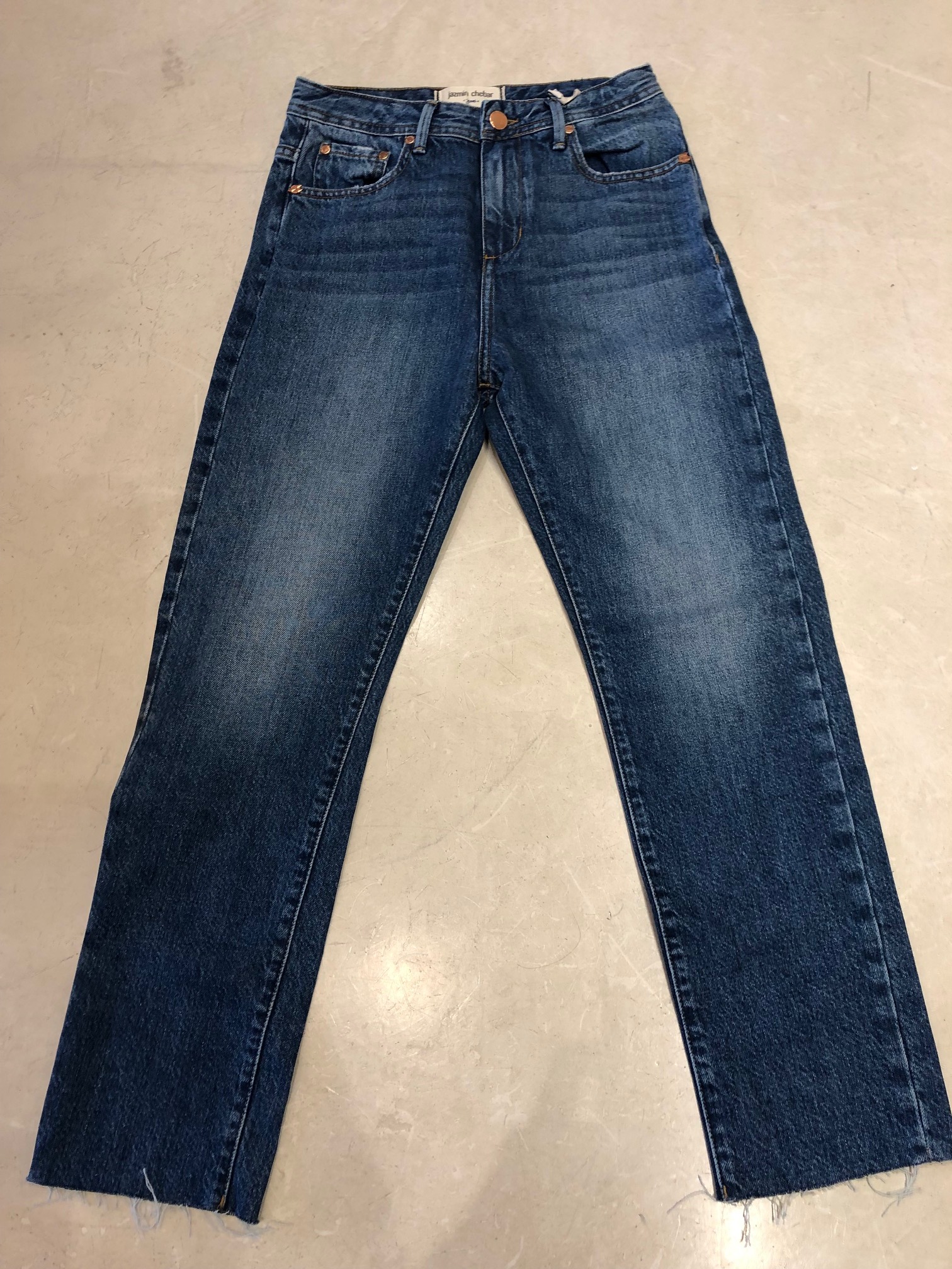 Jean italiano, de Jazmín Chebar, de tiro medio, cae en primera cadera, pierna recta que se afina en terminación son costura.