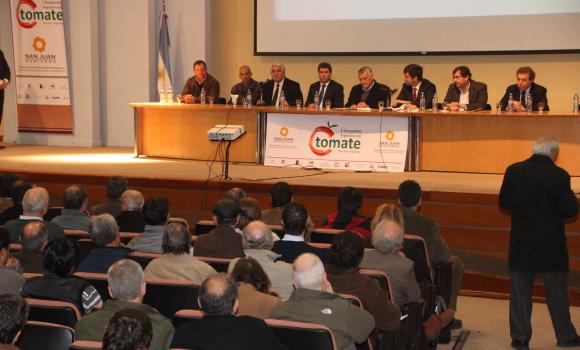 Con 650 inscriptos, el ‘I Encuentro Argentino del Tomate’, realizado en nuestra provincia fue un éxito por donde se lo mire. En la apertura, el gobernador José Luis Gioja habló a los productores, indicando que se los va a apoyar en lo que haga falta, los felicita por lo que ya han logrado y que quiere aumentar la superficie cultivada hasta las 3.000 hectáreas. Recogió el guante José Luis Martín, el representante del sector local presente en la mesa directiva, quien dijo que aceptan el desafío y lo que quieren es tener posibilidades de trabajar en lo que les gusta y lograr una buena rentabilidad. Por su parte el ingeniero agrónomo Cosme Argerich, referente nacional del cultivo del tomate para industria, expresó que acá hay que agrandarse en hectareaje y buscar el alto rendimiento por hectárea que ha llegado -en casos extremos- a 147 mil kilos, ya que en Mendoza hay más superficie pero rinde menos. Dijo que falta sumar más tecnología a la labor de cosecha para ser competitivos. Se mejoró en el paquete de tecnología en general, se utiliza bien el agua pero es necesario avanzar más en la cosecha mecánica.