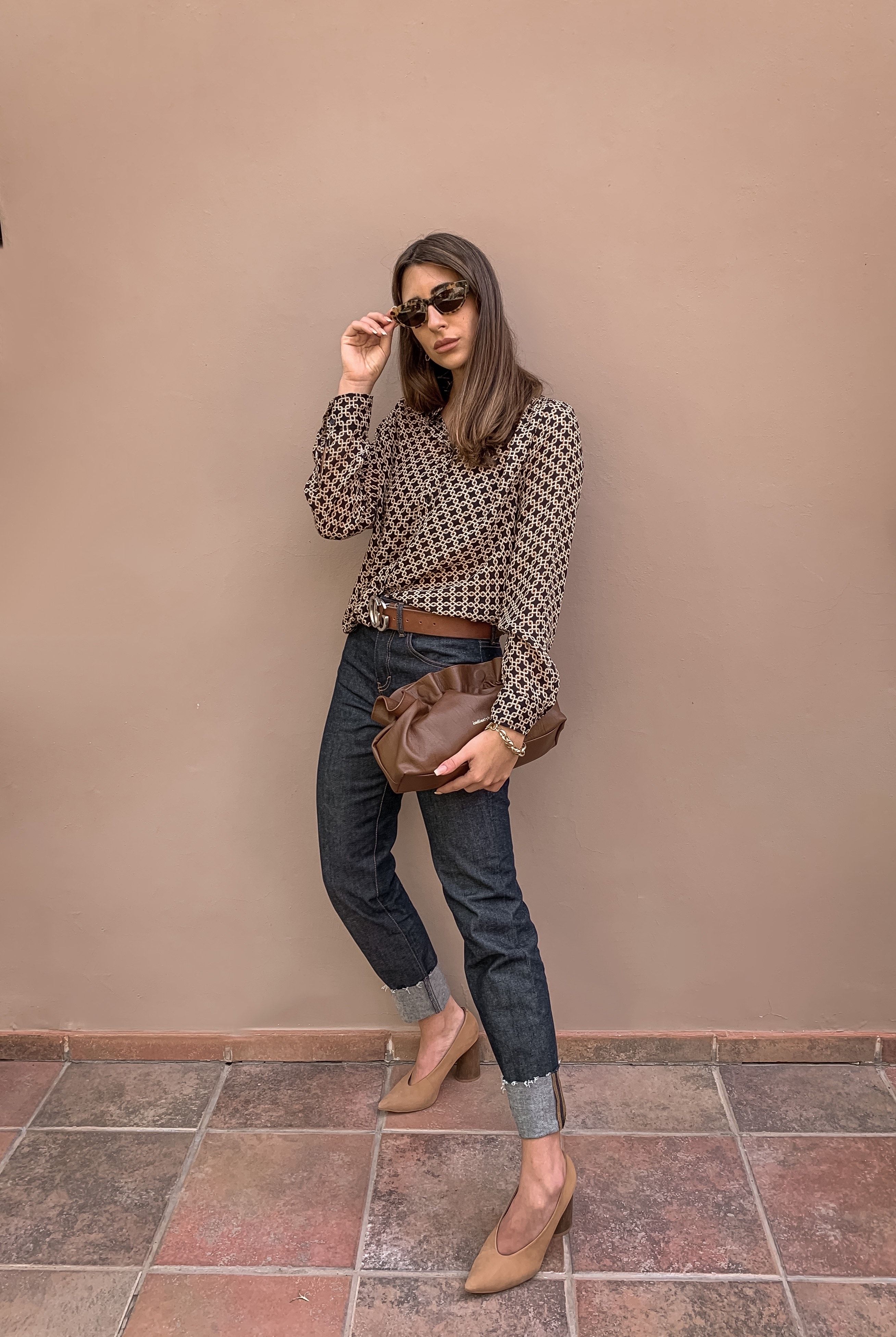 Con este look mostramos un jean que se está viendo mucho, cuya característica principal es la botamanga, es decir el pliegue que podemos ver al final del pantalón. En este caso optamos por uno color azul oscuro y lo combinamos con una camisa estampada y stilettos taco ancho en color suela que le otorgan elegancia al look. Como accesorios, un sobre marrón y un cinto en mismos tonos.
