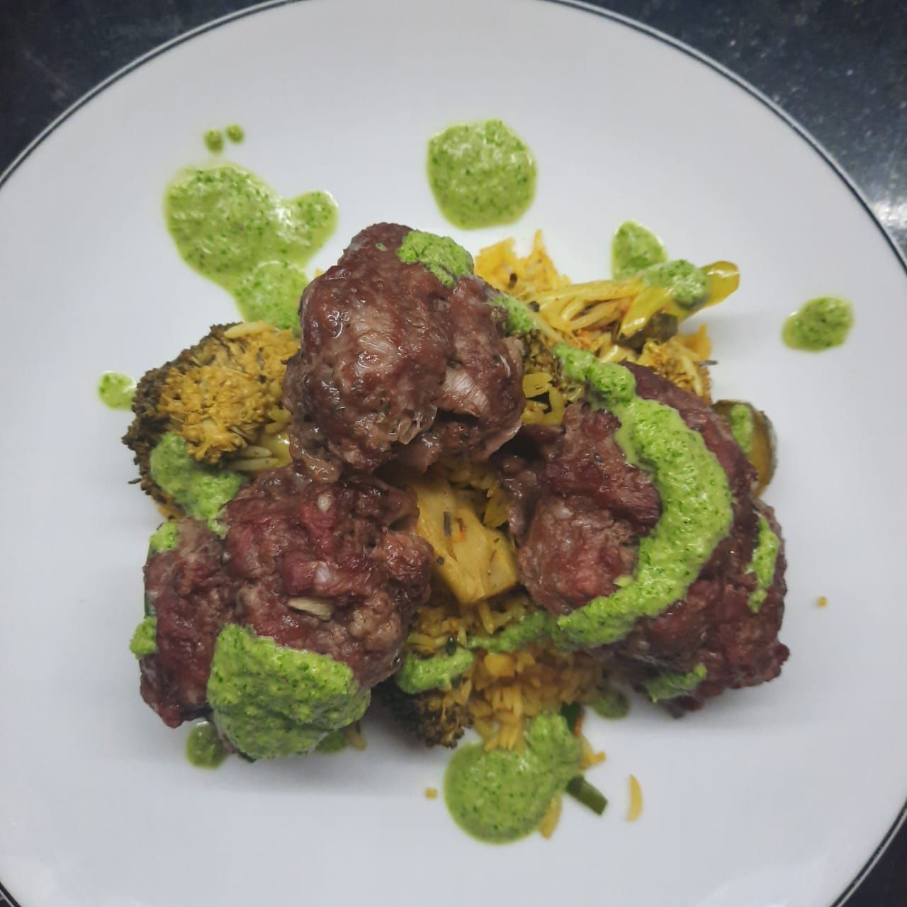 Hasta ahora sus menúes no sólo se han ganado todos los suspiros, sino que se han agotado cada semana. Ya ha propuesto una bondiola rellena con frutos secos teriyaqui casero con compresión batatas y peras, un lomo Wellington (esto es envuelto en masa de hojaldre) con compota de cebolla, una generosa porción de kebab de cordero con pesto de kale y ajos asados con curry de vegetales verdes y arroz basmati y un roll de ave relleno con hongos frescos envueltos en alga nori, manteca de estragón con puré de papas, arvejas frescas y wasabi. Ha preparado pan con ajo y oliva, un pan de nuez para la bondiola rellena y un pan inglés, entre otros.