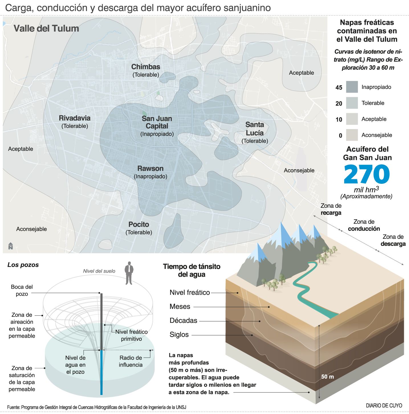 Así planteado "el fortalecimiento del control sobre los acuíferos, tanto en calidad de agua como en su sobreexplotación, deberá tenerse como un objetivo prioritario para las autoridades del agua en la provincia", según Dölling quien agrega: "Supongamos que queremos suplir los 1.000 hectómetros cúbicos que el río San Juan no nos está entregando superficialmente, entonces en unos 30 años habremos eliminado de la cuenca subterránea unos 30 mil hm3, un vaciamiento irremediable y con consecuencias catastróficas incluso para la misma calidad de las aguas subterráneas por descenso de las manchas de nitratos que hoy están más superficiales".