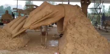 Gané un trofeo por ser la obra más convocante de público de todo el parque. Y mirá que era un parque gigante. Es impresionante. Por eso la obra también tenía que ser gigante. Tiene dos manos: una vieja, en base a la de mi tío Ramón, el hermano menor de mi papá, que tiene 96 años. Hice el molde de su mano senil, artrítica y llena de arrugas. Y otra mano joven, de un niño de 5-6 años, que representa lo que nace, lo que viene. Están ligados por un cincel, como si la mano vieja estuviera labrando la otra que sale la piedra. Quería hacerlo en mármol pero era de tales dimensiones que me resultó imposible. Tiene 6 metros, por 3 de altura y 2 de ancho. Tardé 40 días completos en realizarla y por suerte tuve ayudantes. De hecho me esperaban con la maqueta scaneada, la base en madera y una estructura en barro que yo fui modelando. Así la dejé y ahora ya tiene que estar cubierta de bronce. Y ¿qué le gustó a los chinos de mi obra? Todo el mundo iba y miraba, los viejitos se paraban, los niños y sus padres. Creo que se identificaban con la obra.