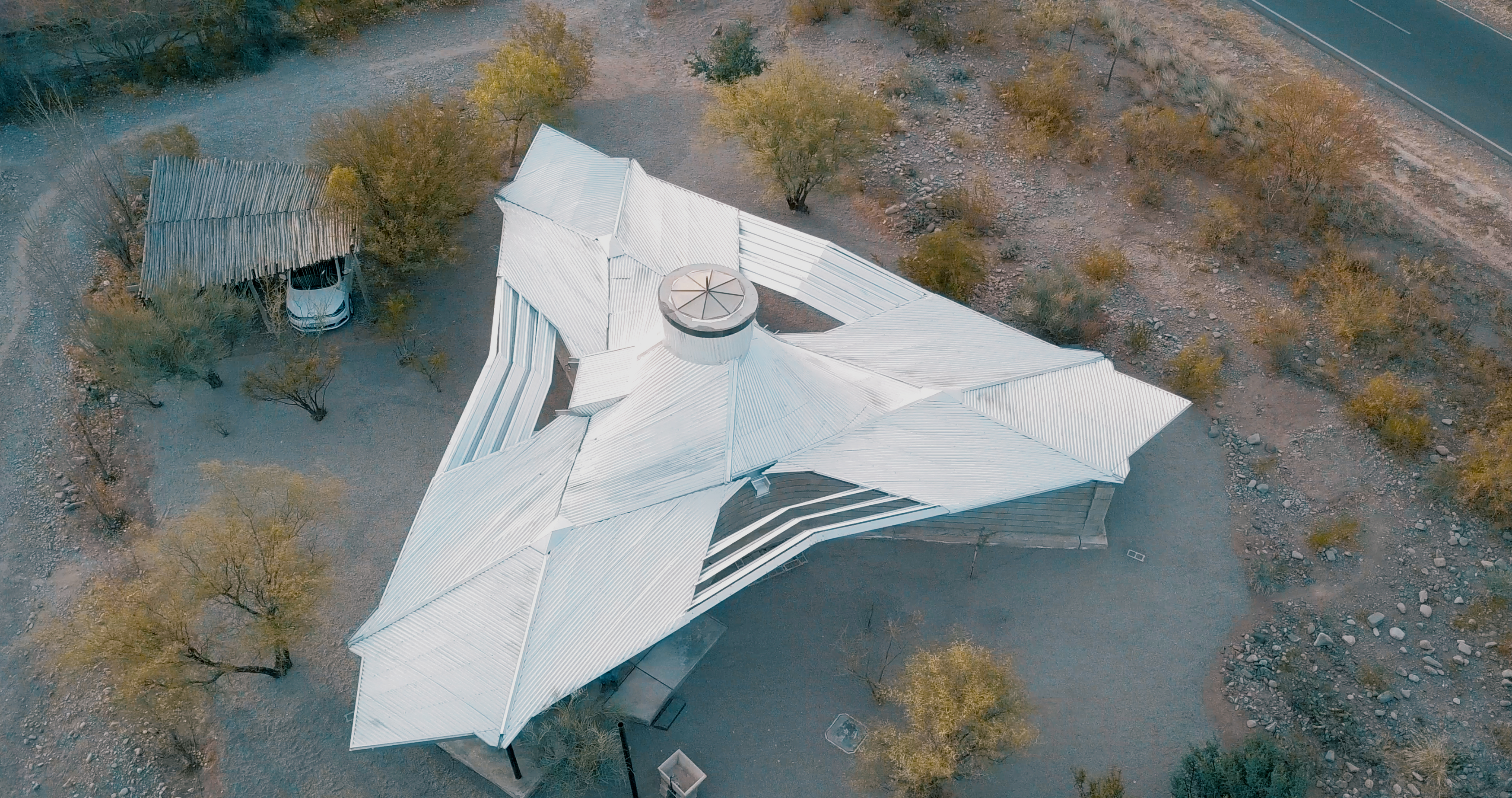 Otro valor agregado es que este original óculo se abre o cierra con una manivela según las necesidades. "Si bien es una cubierta más compleja que un techo tradicional aporta menos uso energético porque funciona más pasivamente al calor. Por eso digo que es un dispositivo aerodinámico ya que así funciona. A esto se suman los parasoles que son chapas ubicadas uniendo a los aleros que completan esa función", agrega.