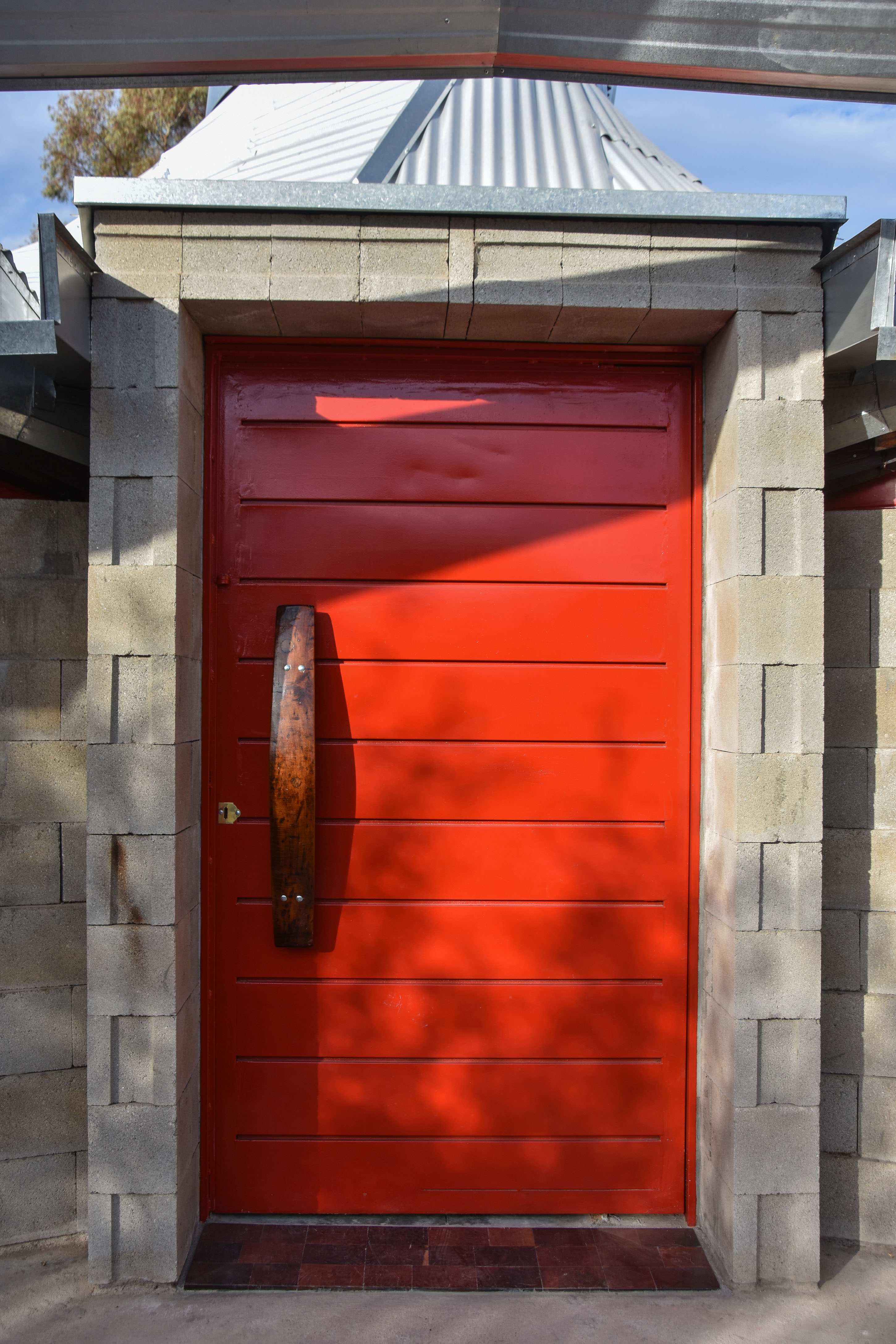El piso es de cemento alisado en tono gris en consonancia con los bloques de cemento, ya que el color rojo de las puertas y ventanas es lo que rompe con los tonos del desierto para dar un impacto visual fuerte y energético.