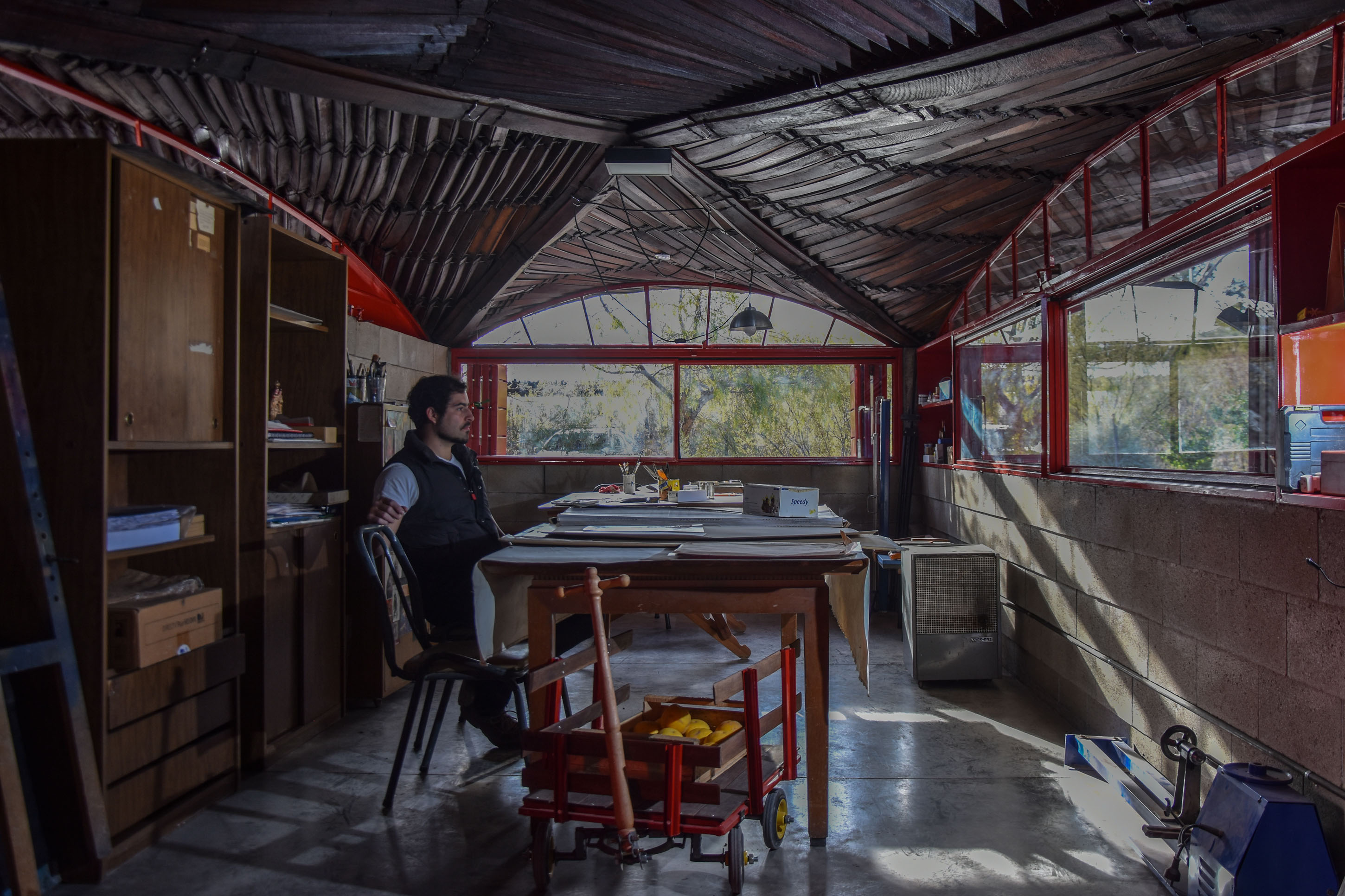 La génesis de este sitio de creación fue por allá por el 2007 cuando falleció su abuelo -Mario Vinzio-, que vivía en calle Patricias Sanjuaninas y General Paz, un lugar muy especial para Lisandro, rodeado de una atmósfera única, como el mismo lo define. En ese momento surgió la idea de comenzar a generar un taller en otro lado. "Así fue que mis padres construyeron su casa en Zonda y decidieron echar raíces, a la par surgió la necesidad de construir este espacio de trabajo. Hay que pensar que la arquitectura está hecha de futuro pero también del pasado por eso es que en esta atmósfera que intenté construir aquí está el recuerdo de mi niñez, de lo perdido, de lo que ya no está y quiero que se sienta. También crecí en el taller de mi papá, por lo que conozco muy bien las necesidades y hasta los olores a pintura, arcilla y cada material que se trabaja. Para mi la materia y la materialidad siempre fueron determinantes y mi arquitectura -ahora que empiezo a ver en perspectiva-, está ligada con todo eso", relata Lisandro.
