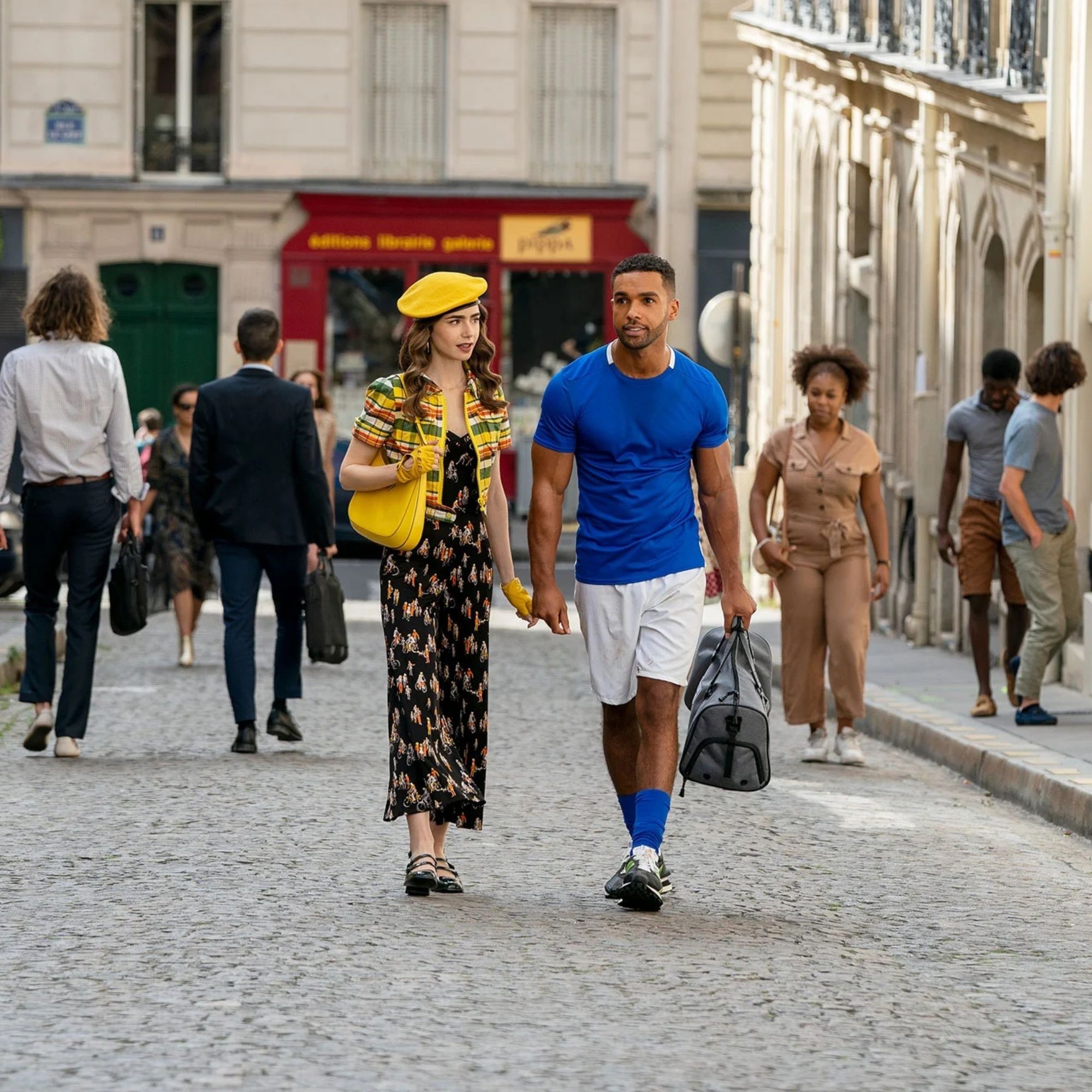 Otro de los clichés que Emily no se cansa de reivindicar es el de las boinas parisinas, las tiene en prácticamente, todos los colores y estampados, las lleva en cualquier ocasión y consigue que redondeen estilismos que, en ningún caso, hubieran resultado planos. Los bucket hats (sombreros de cubo) también tienen un hueco especial, aunque en clave vintage. En la serie incluso hay algunos accesorios, como ese charm con la forma de la torre Eiffel, que casi acaparan todo el protagonismo durante un solo episodio. Los bolsos 2.55 de Chanel en todos los colores y los zapatos más envidiados también piden paso a lo largo de los capítulos.