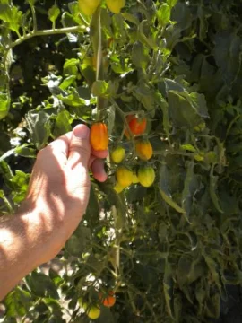 La hora de la visita no fue la mejor, a media mañana, pero el emprendimiento productivo de carácter hortícola bien vale la pena. Es que la cosecha de tomates cherrys que tiene Gualberto como mediero en la calle Mendoza cerca del Aeródromo de Pocito, arranca a las 6 de la mañana y continúa hasta las 10,30 o un poco más si hay que cargar, y a esa hora llegamos a la finca. Estos tomates pequeños los comercializan totalmente a la provincia de Mendoza y desde hace 3 años los producen para diversificar las producciones de todo tipo de chacras que hacen desde siempre.