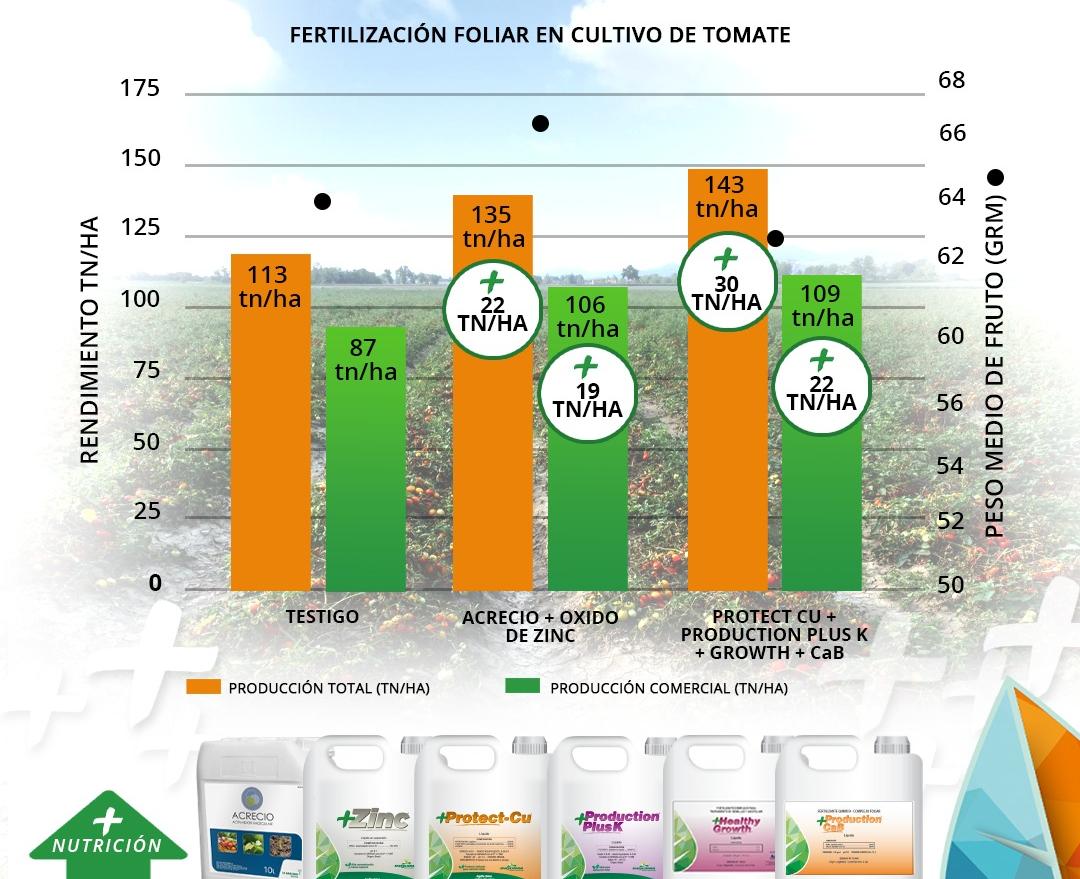 En base a los resultados obtenidos se concluye que, no se observaron diferencias significativas entre los tratamientos analizados. Si se ve que la aplicación de Growth " CaB (tratamiento 3: T3) y Protec Cu " Producción Plus "Growth " CaB (tratamiento 4: T4) manifiestan tendencia a incrementar la producción total y comercial. No se observaron mejoras sustanciosas respecto a la concentración de sólidos solubles.