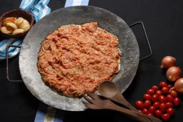 Poner en la sartén un poco de grasa y una vez que está caliente, echar las cebollas cortadas en rebanadas. Cuando las cebollas están un poco cocidas agregar la carne y darle unas vueltas sin dejar que se cocine totalmente. Retirar del fuego y salar y pimienta a gusto, agregar las aceitunas y huevo duro picados. Por otro lado, preparar la masa poniendo en la mesa la harina, hacer un hueco en el medio, poner la salmuera fría y el azúcar. Tomar la masa cuando está unida y amasarla muchas veces para luego formar bollos, más bien gruesos, que se estiran con el palote formando círculos. Poner el relleno en el centro y cerrar pegando con salmuera, hacer el repulgue y cocinar en horno fuerte.