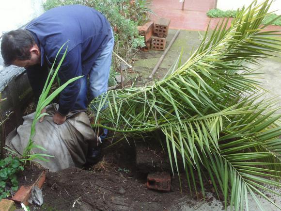 5º Colocar la planta en el hoyo. Se incorpora la planta en el nuevo lugar y se va rellenando el hoyo de tierra mientras se mantiene la planta recta. Al rellenar el hoyo se debe incorporar la tierra respetando la posición y estructura inicial de las capas del suelo. Una vez relleno el hoyo, compactar el suelo con el talón para eliminar bolsas de aire.