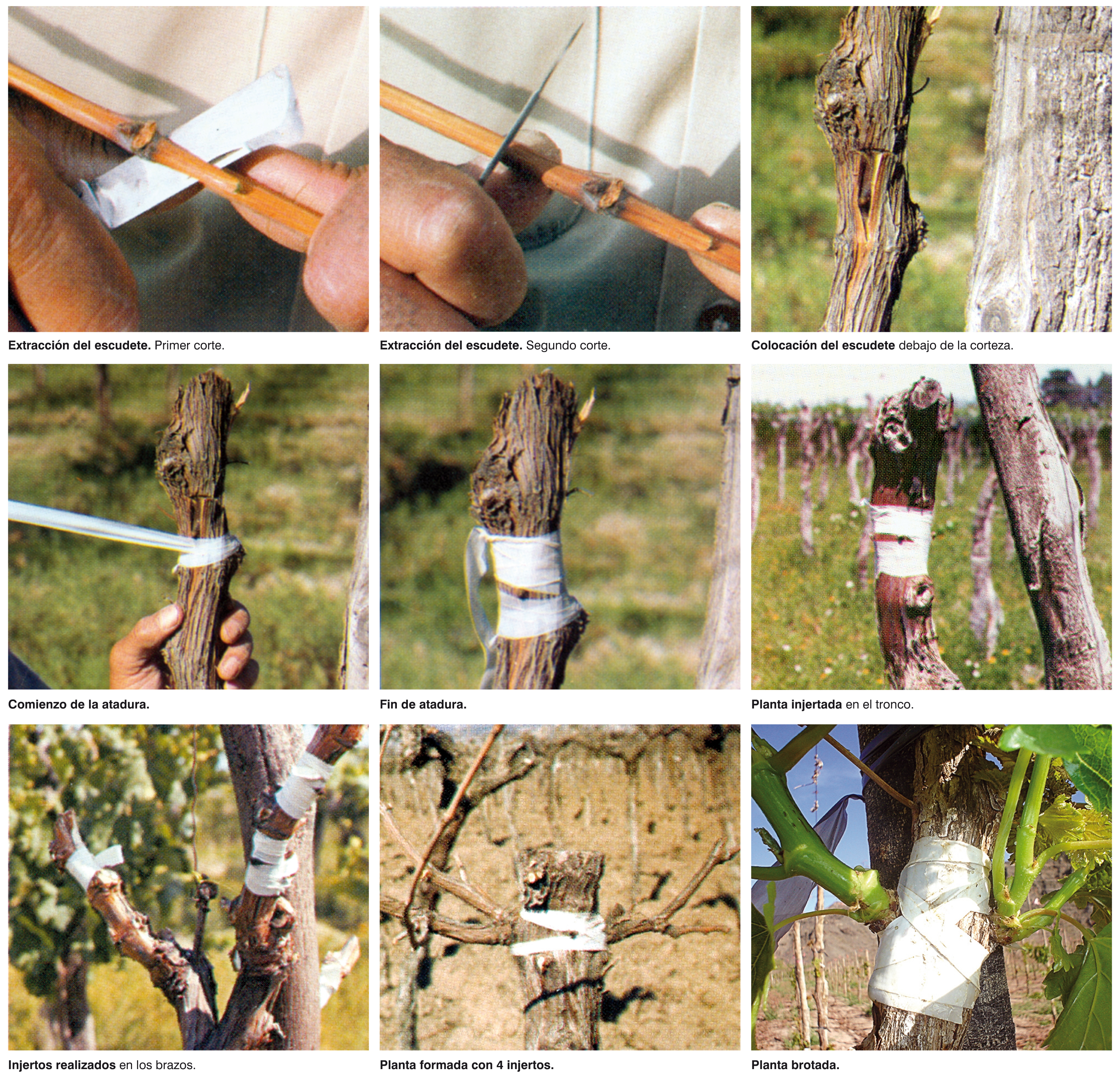 Los injertos deben colocarse en los sectores más lisos del tronco. Después que el brote ha crecido suficiente puede cortarse la cinta de la zona inferior de la yema manteniendose así sujeto. Se aconseja quitar los brotes que salgan del pie de la cepa y hay que cuidar que los escudetes no se deshidraten.