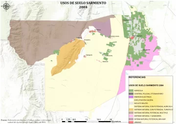 "Otro de los análisis se hizo en base al relevamiento de usos del suelo por medio de imágenes satelitales de los años 2004 y 2020. Se desarrollaron dos mapas. Uno de los usos de suelo en el año 2004 y otro de los usos de suelo en el año 2020", afirmó el geógrafo agregando: "Se destaca el incremento de las zonas agrícolas, particularmente hacia el oeste de la Ruta Nacional 40, resaltando zonas que antes eran desiertos y ahora son desarrollos agrícolas partir de las implementación de las leyes de promoción económica en los años 90 o inversiones privadas, logrando un mayor impacto económico con la puesta en funcionamiento de la Estación Transformadora Cañada Honda. Se ve claramente en la expansión espacial de las configuraciones agrícolas hacia el oeste departemantal".