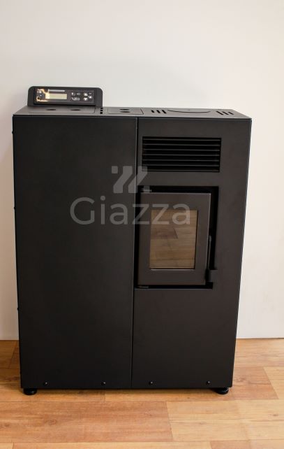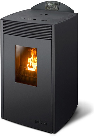 Estufa estanca con la posibilidad de tomar el aire comburente directamente desde el exterior. Estructura de acero con revestimiento de metal. Hogar y brasero de hierro fundido de grosor elevado. Vidrio cerámico (800¦) autolimpiante. Grupo hidráulico integrado formado por bomba de circulación, válvula de seguridad, tanque de expansión cerrado y manómetro. Válvula de anticondensado integrada. Pantalla digital con mandos táctiles. Horarios de funcionamiento programables tanto a diario como semanalmente. Amplio cajón de la ceniza. Potencia térmica total 15.37 kW.