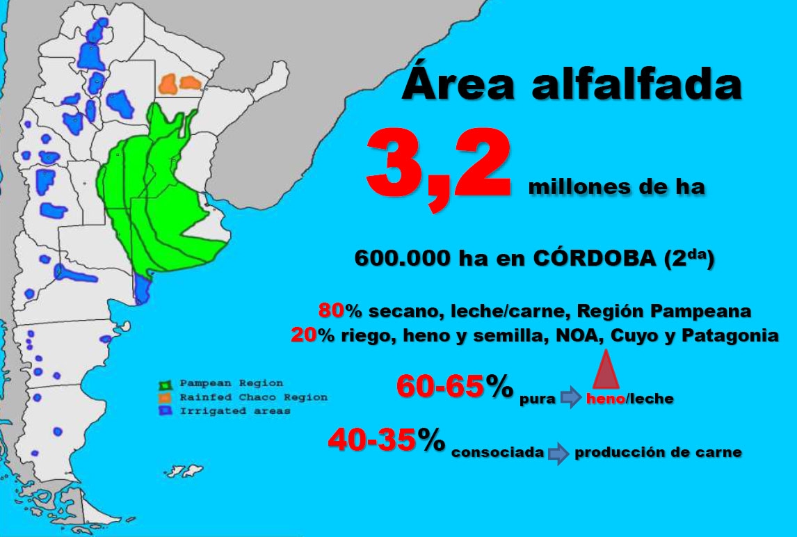 Nuestro país tiene una superficie de 3.200.000 hectáreas sembradas con alfalfa pura (que incluye a pasturas consociadas base alfalfa) y la inmensa mayoría de su producción va al mercado interno. Sólo se exportan unas 40 mil toneladas entre heno, pellets y cubos. De acuerdo a datos aportados por el Ministerio de Agricultura de la Nación, en 2017 Argentina exportó 54.500 toneladas y en 2018 ese número bajó a 38.998 toneladas, esto es el 0,2% del mercado mundial. Estos datos fueron aportados en la conferencia de prensa que tuvo lugar en la Sala de Sesiones del Rectorado de la Universidad Nacional de Villa María.