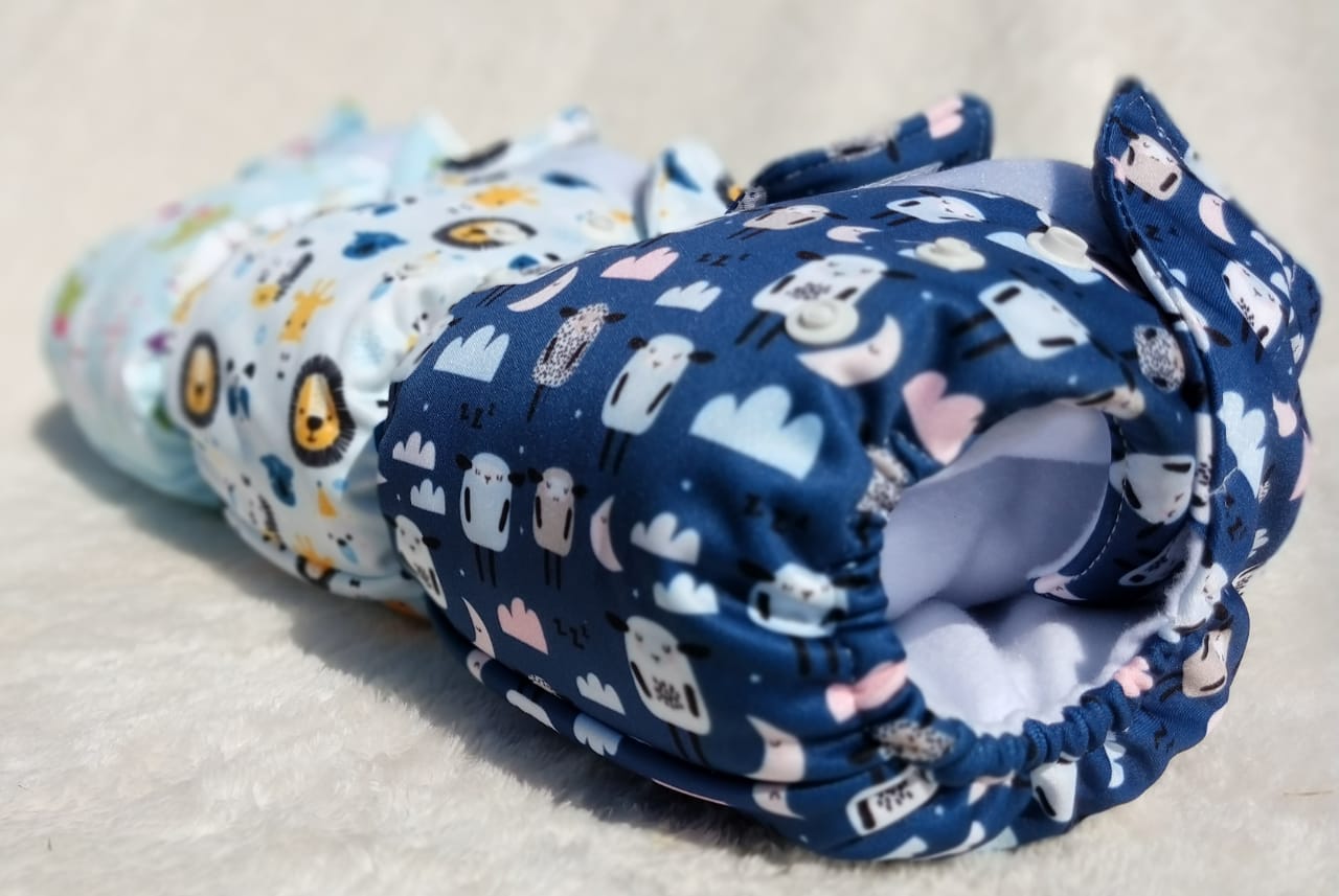 Las creativas, que se ocupan de los diseños y de la costura (aunque tienen modistas que las ayudan) tienen varios modelos, en varios colores. Vienen en dos tamaños: uno para recién nacidos y otro multitalle para bebés de 5 a 15 kilos (aproximadamente de 2 meses a 2 años y medio). Este pañal trae un sistema de ajuste de tiro con botones que permiten regular la altura y a su vez velcro en la cintura para que quede bien cerrado según el diámetro de la pancita de cada bebé. Ofrecen pañales para el día y para la noche, con mayor o menor porosidad de la tela externa.