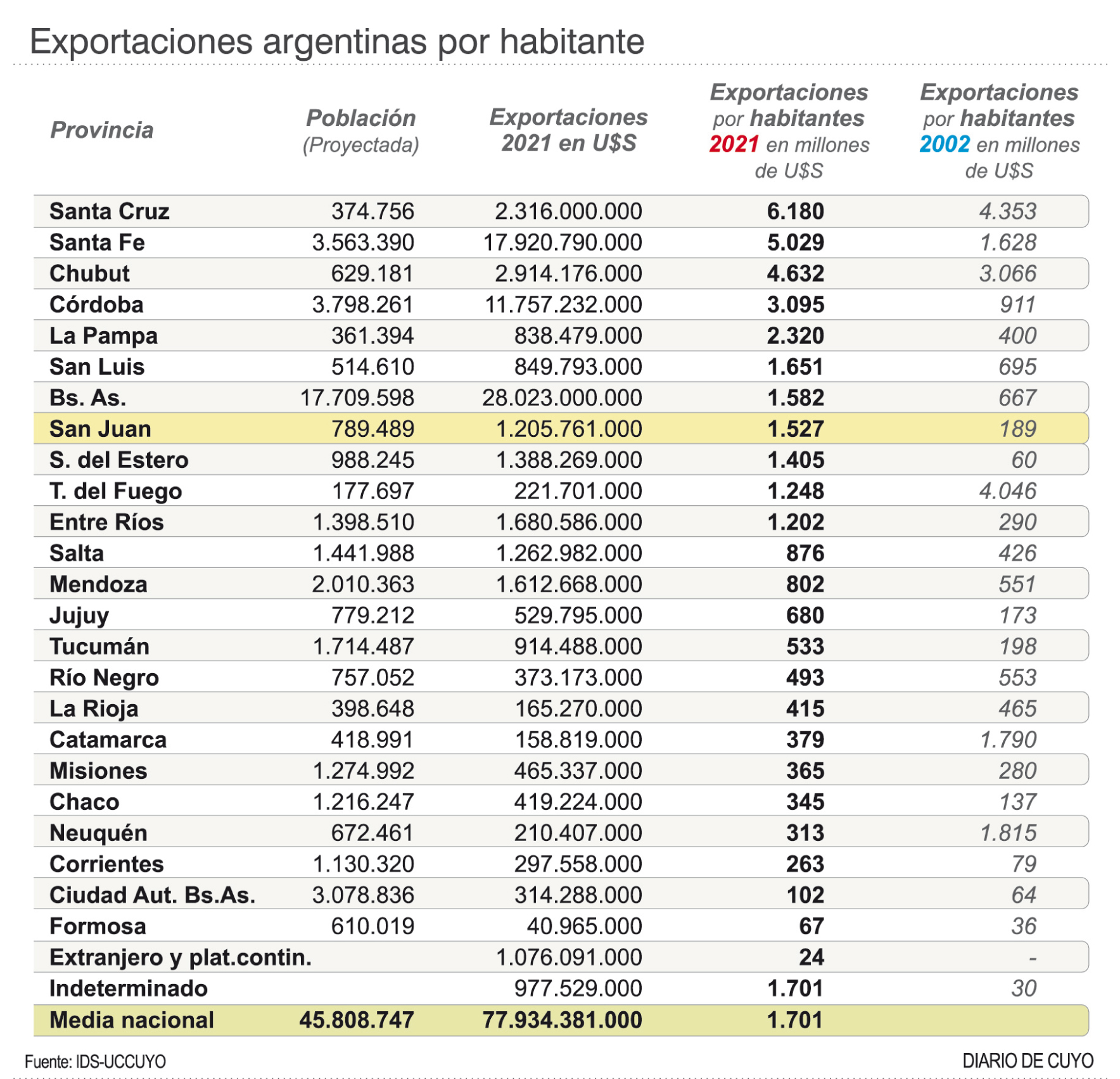 El informe destaca que San Juan actualmente está octavo en exportación per cápita, detrás del líder Santa Cruz con U$S 6.180 por habitante, Santa Fe, Chubut, Córdoba, La Pampa, San Luis y Buenos Aires. Cabe destacar que este ranking rompe con el mito de una Ciudad Autónoma de Buenos Aires generadora de riqueza al dejarla penúltima con apenas U$S 102 por porteño y seguida sólo por Formosa, con U$S 67 por formoseño.
