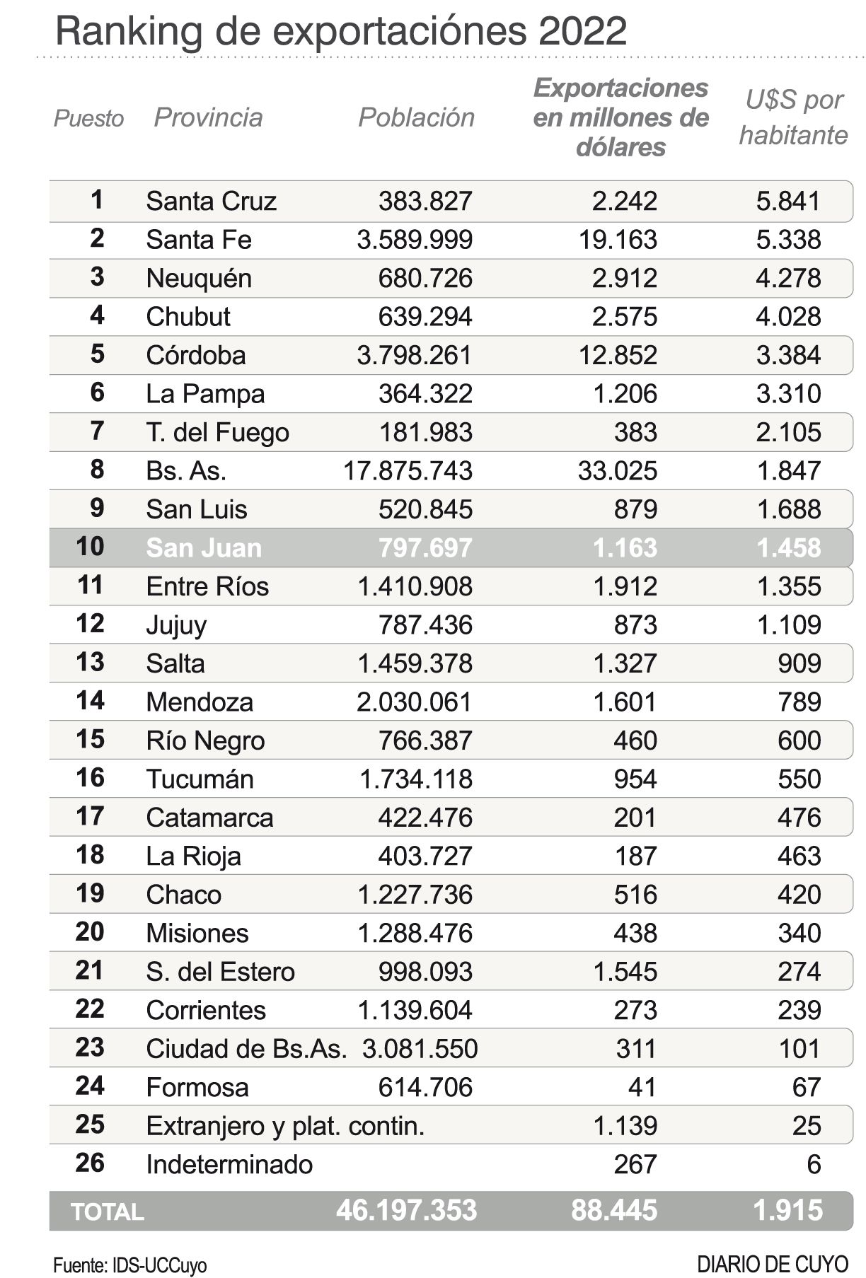 En 2019 exportamos U$S 1.246 millones FOB y los sanjuaninos éramos 773 mil. El 2022 la población aumentó a 798 mil personas. Hemos retrocedido unos U$S 80 millones desde el 2019 a la fecha. Ahora nos ubicamos décimos en la tabla y esto se nota en nuestra economía.