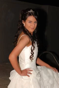 Su vestido quinceañero lo realizó su tía abuela, Dolores Hierrezuelo de Nozica, con el peinado de Sergio Rodríguez y maquillada por Daniela López.