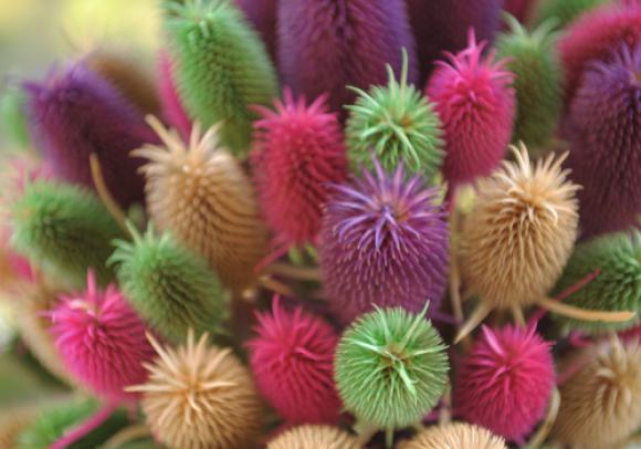 Otro elemento que sumamos a la producción de flores secas son los cardos, considerados por muchos como una maleza o desperdicio, para nosotras son materia prima, indicó la jefa del INTA Iglesia. Los cortamos, teñimos en el mismo líquido y proceso que se colorean las lanas y los vendemos como ramos para adorno.