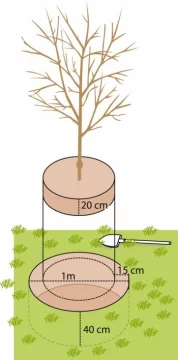 Cavar un hoyo de forma cilíndrica. El diámetro será de 15 centímetros mayor al del pan de tierra o raíz a plantar (Ej: 15 + 15 = 30 centímetros). Debe quedar un espacio libre en toda la circunferencia, debe entrar una bota entre el pan de tierra y la pared del hoyo. La profundidad del hoyo será de 20 centímetros más que el alto del pan, terrón o raíces.