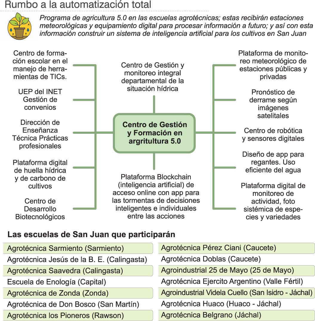 Justamente en eso se resume este proyecto de "Construcción Colectiva de un Centro de Formación, Investigación, Incubación, Desarrollo y Control de Servicios Tecnológicos de información y comunicación para la Agricultura 5.0 para la provincia de San Juan", marcó el licenciado Codorniú, agregando, "pensado en la Escuela Agrotécnica Sarmiento como ejemplo, "se sugiere generar en tres establecimientos educativos de las tres cuencas hidrológicas principales de la provincia de San Juan, nodos de tecnologías de la información y comunicación que interactúen con las restantes 13 escuelas agropecuarias en la potenciación de la agricultura 4.0 aplicada a la educación".