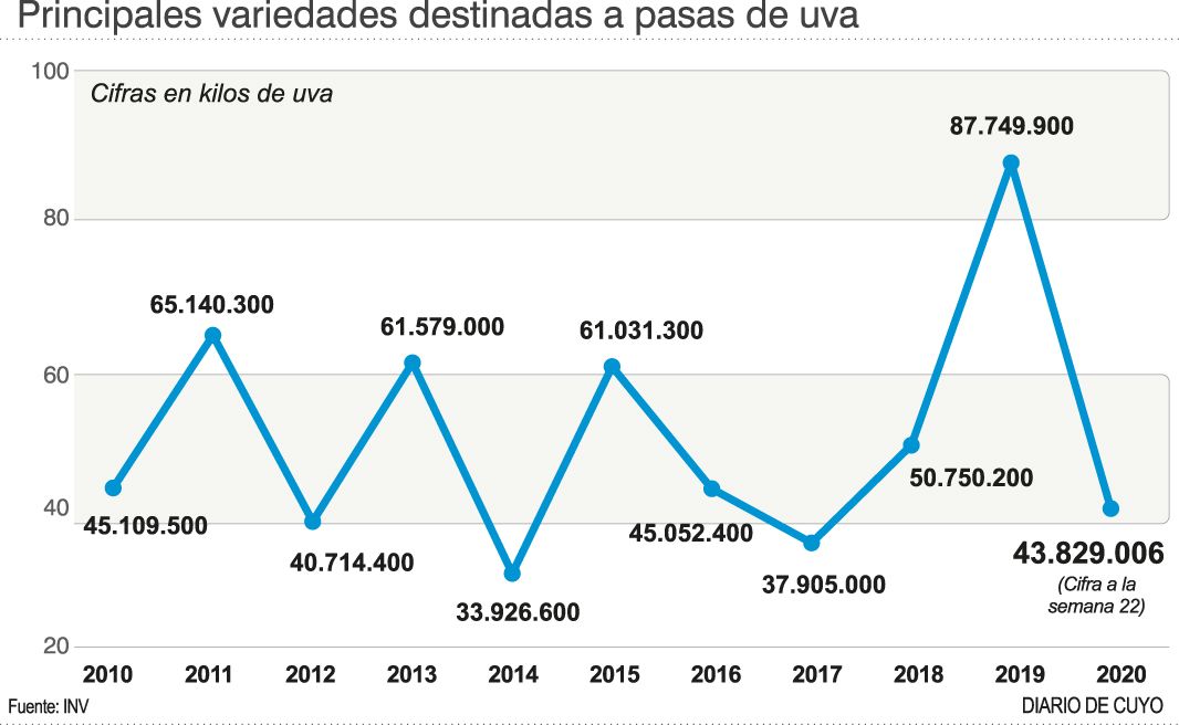 Esto es que 87.749.900 kilogramos de uva totales cosechados en el país fueron desecadas al sol la campaña anterior. Pero si uno analiza la década pasada, el ingreso de uva a los secaderos creció, luego de muchos altos y bajos, un 94,5%. En el 2010 los secaderos recibieron 45.109.500 kilogramos de uva.