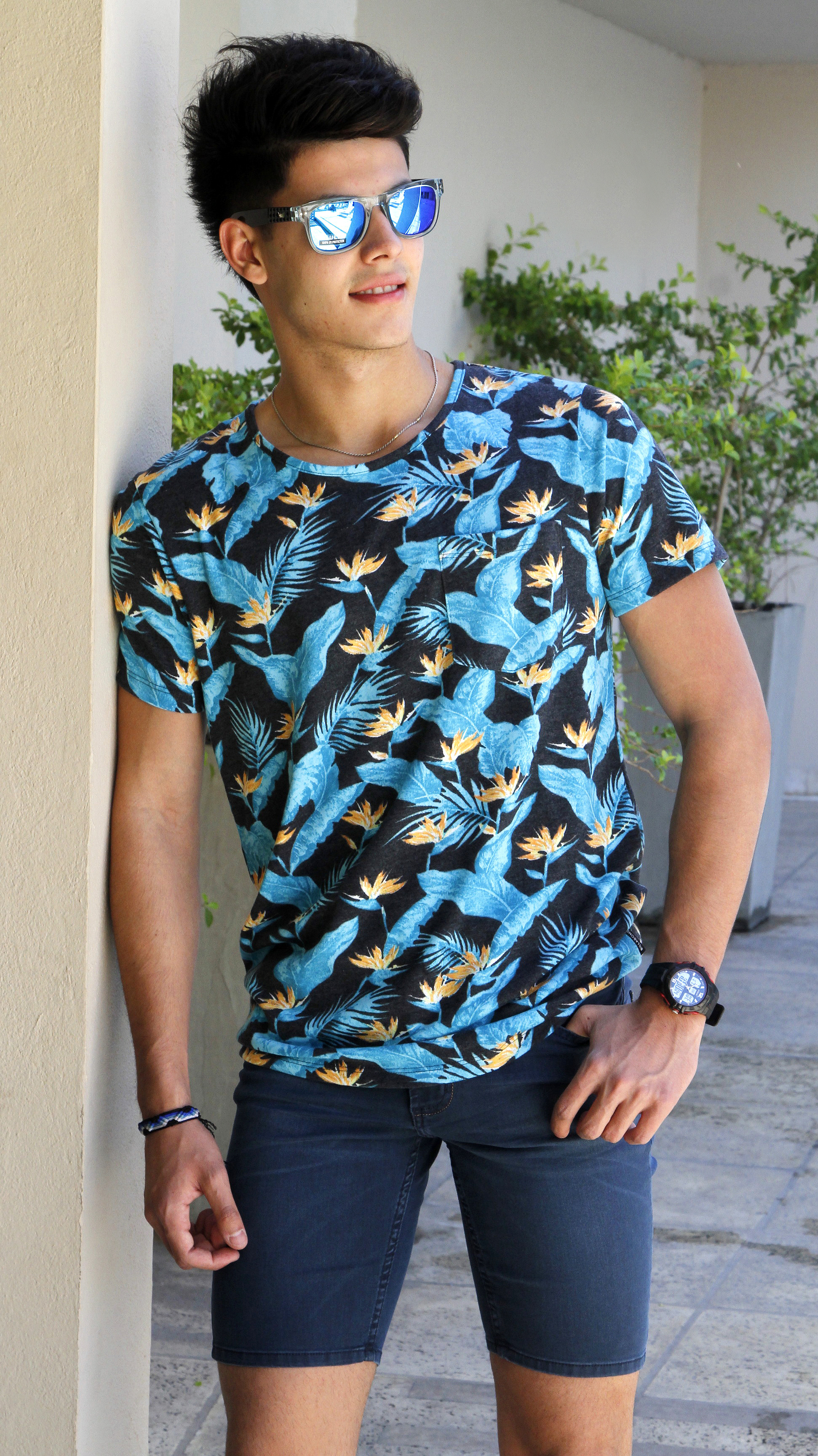 Bermuda de jean elastizada ($1.250, Vulk), con una remera estampada chupín ($650, Billabong) y unos anteojos espejados ($1.350, Vulk).