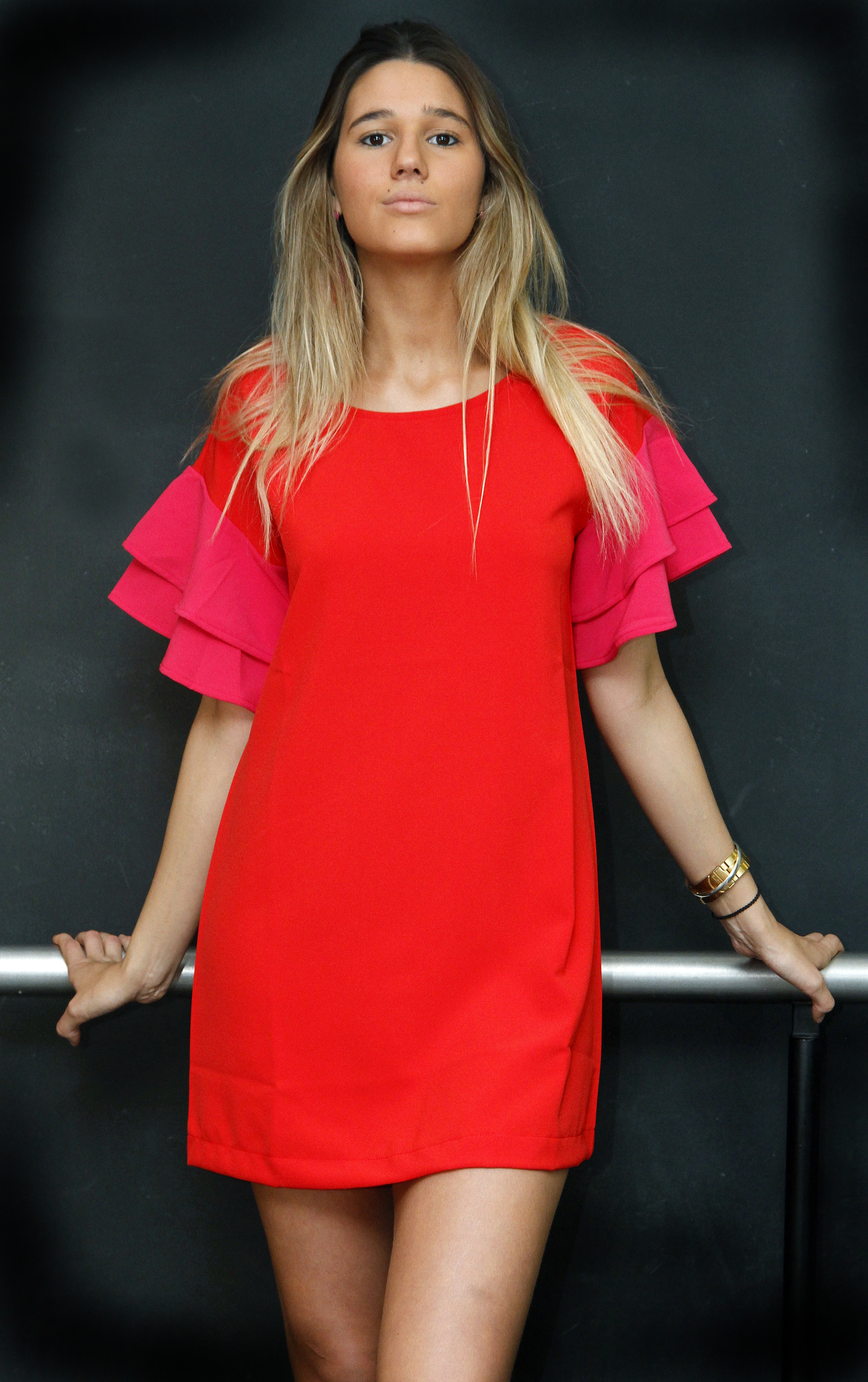 Vestido de creppe con mangas con vuelos doble capa a contracolor ($1.590, Millie), con unos aros colgantes de mostacillas ($330, Dolores Iguazel). En los pies unas ojotas de pelo a ($1.220, The New Black).