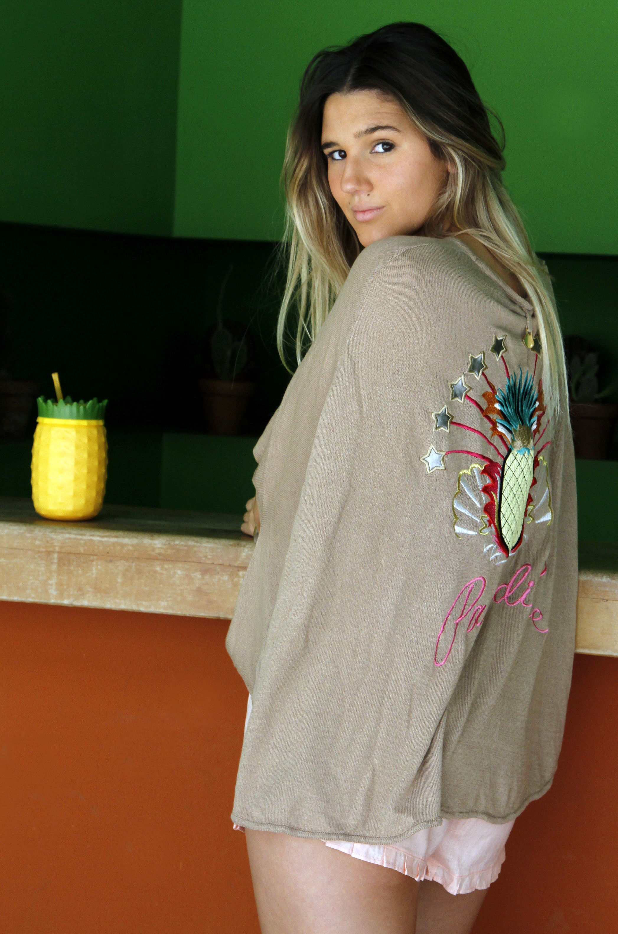 Short de lino con cintura elastizada ($630, The New Black), con un poncho de hilo con bordados en la espalda ($1.580, Millie).