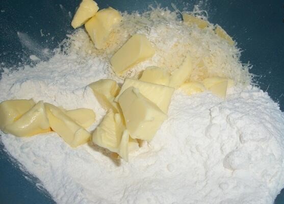 En un recipiente mezclar la premezcla, la sal e incorporar el queso rallado. Cortar la manteca en cubito, agregar y mezclar hasta formar una arenilla. Por último, sumar la crema de leche hasta formar una masa tierna.
