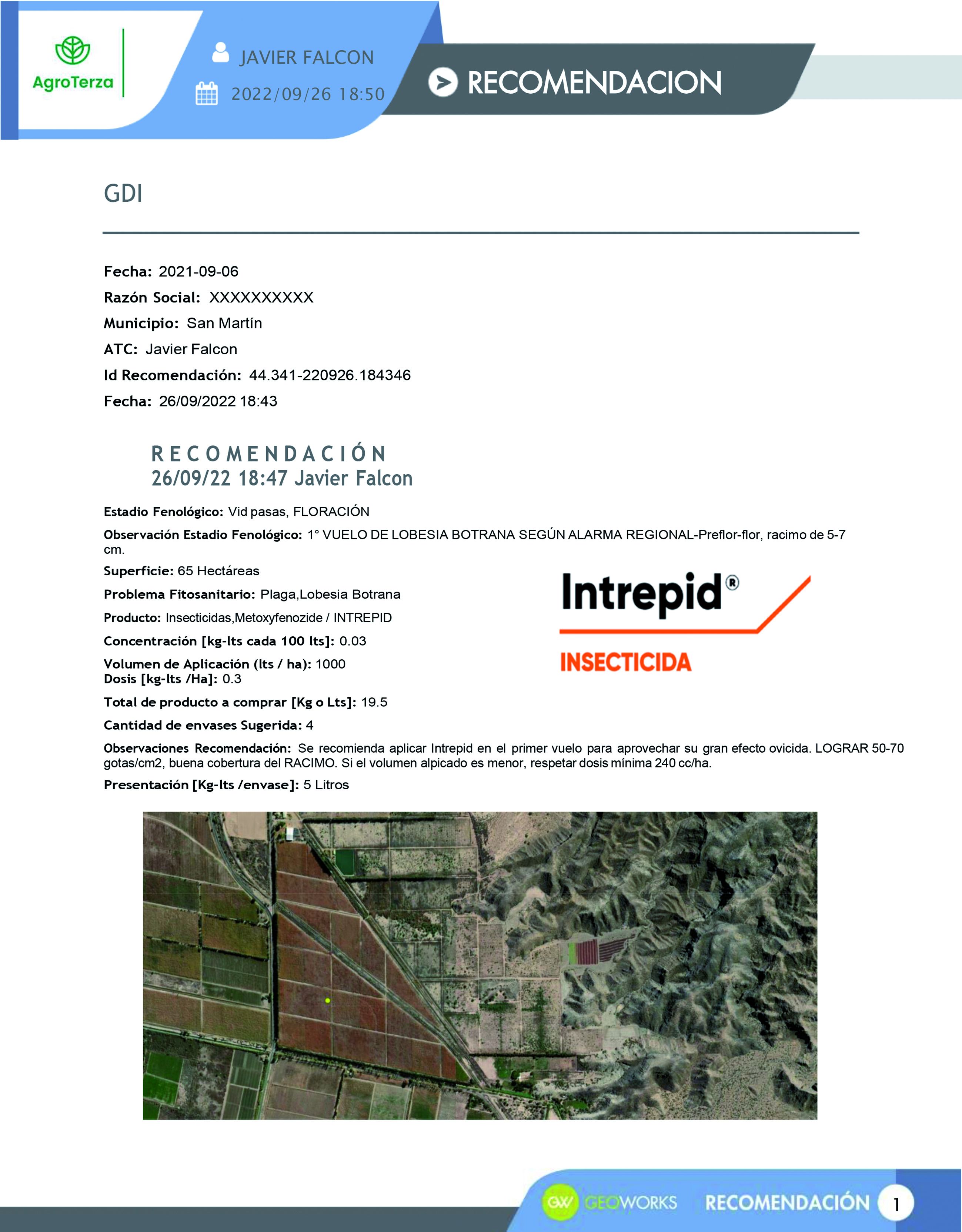 Agregaron que "en el Ciclo Generación de Demanda, Agro Terza S.A. recomienda los insumos a aplicar, el productor compra a una distribuidora, que luego informa a Corteva que repone stock e informa de la compra. En la Recomendación que nosotros brindamos, se hace una ficha completa, que incluye: Fecha, hora, Razón Social, Lugar, ATC (ingeniero asesor), Id de la recomendación (numeración), cultivo, estado fenológico, observación, superficie de cultivo, problema (identificación de plaga, enfermedad o maleza), producto a usar, concentración, volumen de aplicación, dosis, total del producto a comprar, cantidad de envases, presentación del producto comercia y finalmente, los consejos para la aplicación. Además, va la ubicación en Google del sitio".