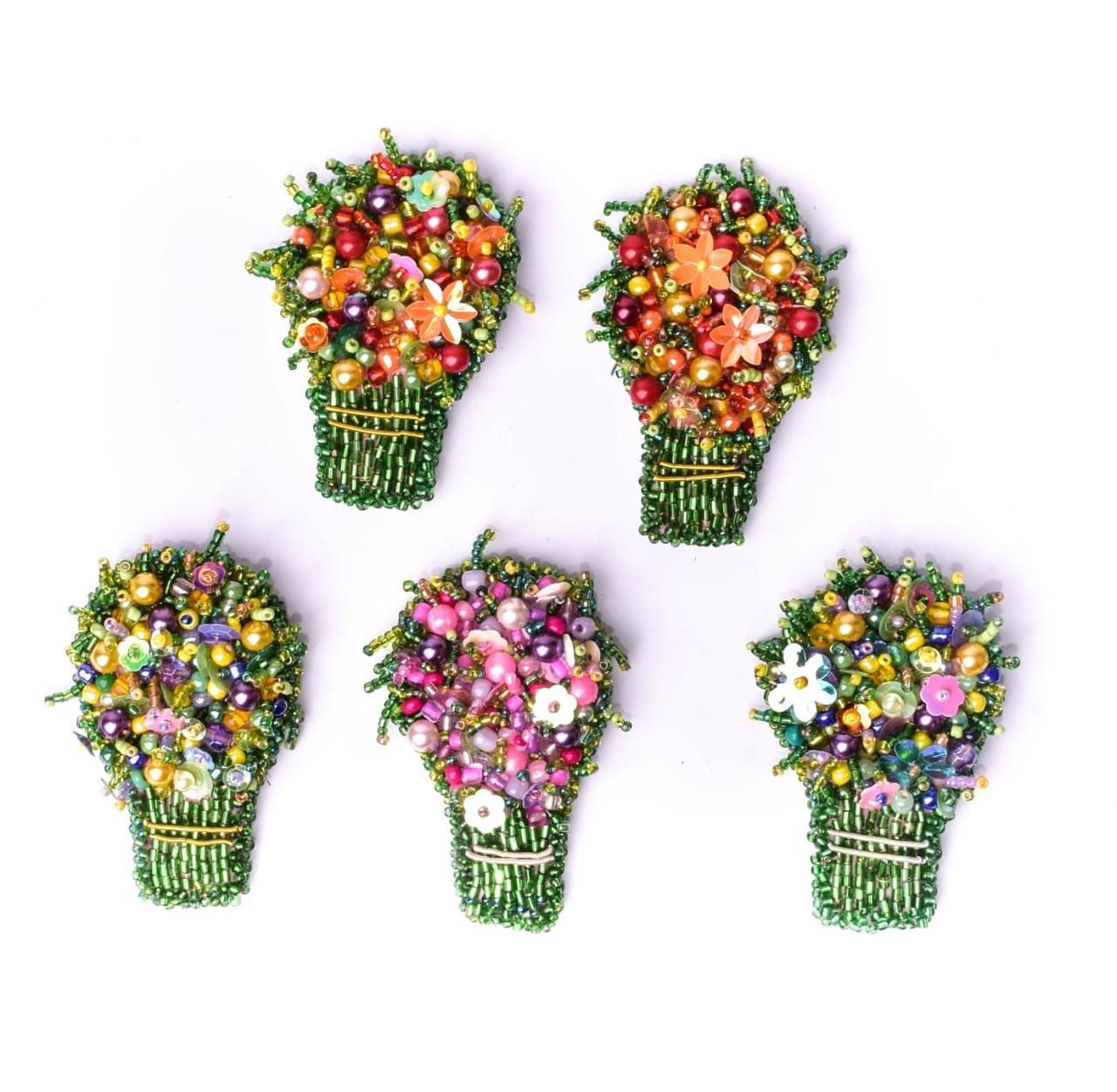 Este diseñador de Alta Costura armó un catálogo que mantiene a lo largo del año y va renovando con diseños nuevos: banderitas, corazones, mariposas, círculos, mapas de Argentina, flores, tréboles, plumas ataviadas con cristales de roca, gemas, perlas de vidrio, paillets, mostacillones, canutillos y mostacillas celeste, blanca, doradas y plateadas. "Nada es pegado, se cose piedra por piedra. Algunas, depende el modelo, son más pesadas y otras más livianas. Pretendo que cada broche sea un accesorio sofisticado, que resalte y llame la atención”, define.