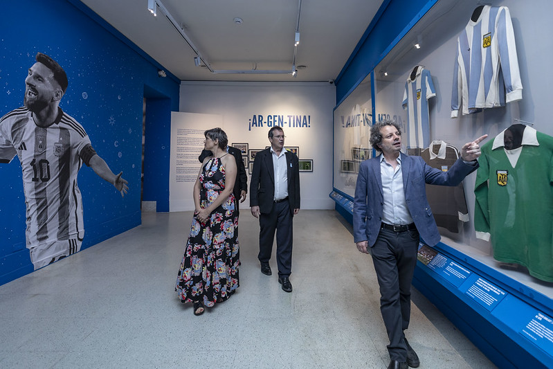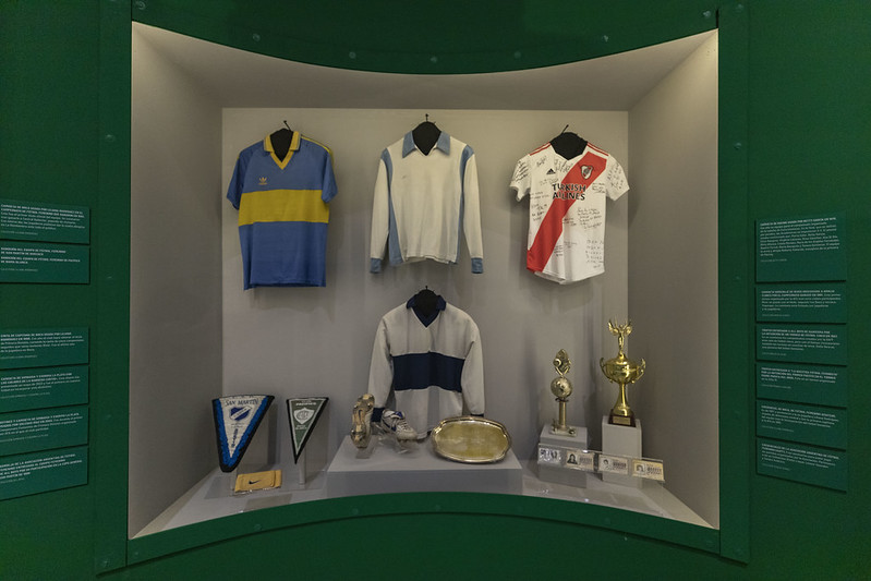 Un largo recorrido de camisetas históricas, comenzando con una usada en 1901 por los jugadores del club Alumni e incluyendo las que vistieron en distintos equipos los grandes ídolos del fútbol argentino a lo largo del tiempo; camisetas importantes de la selección, desde la que usó Onzari para marcar un famoso gol olímpico en 1924 hasta una de Messi en el Mundial 2014 y otra de Lautaro Martínez en la Copa América 2021, pasando por todas las décadas y los Mundiales de 1978 y 1986; pelotas de tiento de 1890 y otras de distintas épocas; butacas de estadios míticos, y cientos de objetos más forman parte de la muestra Pasión de Multitudes.