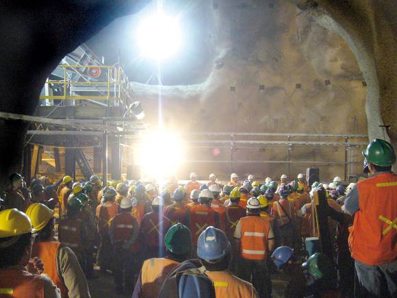 Fue mucho el tiempo, el dinero y el trabajo que pasó entre las primeras huellas mineras realizadas en 1998 y la inauguración de la mina a cargo de la empresa Minas Argentinas (MASA), subsidiaria de la firma anglocanadiense Yamana Gold. Hoy parece sólo un recuerdo aquellos helicópteros que transportaban los elementos para armar el primer campamento y las máquinas necesarias para ir preparando el terreno. En esos mismos lugares donde años atrás sólo existía un cuartel menor, hoy hay grandes máquinas e imponentes construcciones en pleno funcionamiento, que se destacan a los 1.949 metros de altura en los que se encuentra ubicada la mina. “La formación geológica de Gualcamayo permite que se pueda ver todo el lugar. Existen zonas muy imponentes como la zona de trituración o la gran cinta transportadora del mineral. También el buzón de transferencia, un gran tubo incorporado en la montaña a través del cual desciende el mineral”, comentó Alejandro Flores, superintendente de Comunicaciones de MASA.
