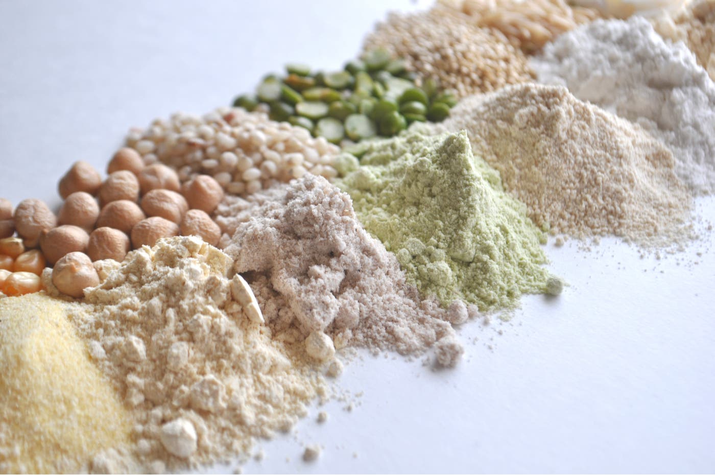 En este grupo está la harina de arroz integral (aporta carbohidratos complejos, vitaminas y minerales varios que ayudan a saciar el apetito y a nutrir el organismo. Es de gusto neutro. Sirve para preparar panes horneados, aunque es un ingrediente famoso en la cocina japonesa, tanto en sus fideos o postres tradicionales), la harina de maíz (tiene similar aporte calórico que la harina de trigo pero posee mayor aporte de grasas saludables y un porcentaje de fibras muy superior, contiene carotenos de ahí su color amarillo), harina de trigo sarraceno (es de color gris y su sabor intenso tiende a dominar las preparaciones, por lo que se recomienda mezclarla con otras harinas), harina de sorgo, harina de garbanzos (es versátil y rica en fibra y en proteínas de origen vegetal), harina de algarroba (se produce de la molienda de la chaucha del fruto del algarrobo, un árbol nativo en San Juan, que ofrece un alimento de alto valor nutritivo. Es ideal para pastelería y panificados e inclusive se dice que es un sucedáneo del cacao).