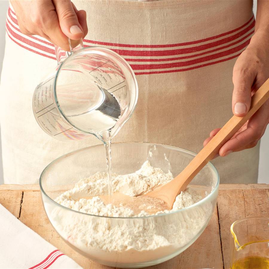 Mezclar los ingredientes secos: harina de garbanzos, almidón de maíz, semillas de sésamo, polvo de hornear, sal y azúcar. Incorporar aceite y agua. Si la masa queda pegajosa se recomienda agregar un poco de harina de garbanzos.