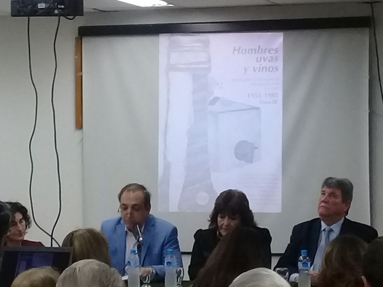 El pasado 28 de julio en el Auditorio de la Facultad de Filosofía Humanidades y Artes, de la Universidad Nacional de San Juan, fue presentado el libro "Hombres, uvas y vinos, Aportes para la historia de la vitivinicultura de San Juan 1955-1985".