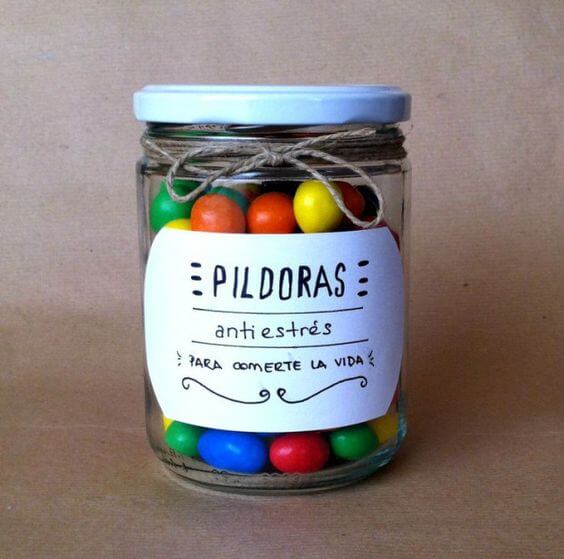 Este regalo no solamente lo liberará del estrés, sino que también le sacará una sonrisa y el endulzará el día. Para este regalo necesitas un frasco pequeño, que llenarás de confites. Fuera del frasco puedes colocar una pegatina o adhesivo que diga “Píldoras anti estrés”. Un regalo fácil, sencillo, económico y reconfortante para tu amigo o amiga.