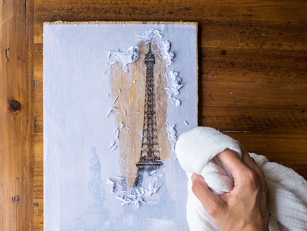 Para finalizar, una vez pasado el tiempo, con un pulverizador aplica agua sobre el papel y retira el mismo con el trapo. Para que la imagen dure más tiempo, coloca barniz. El resultado te sorprenderá tanto que querrás dejarte el regalo.