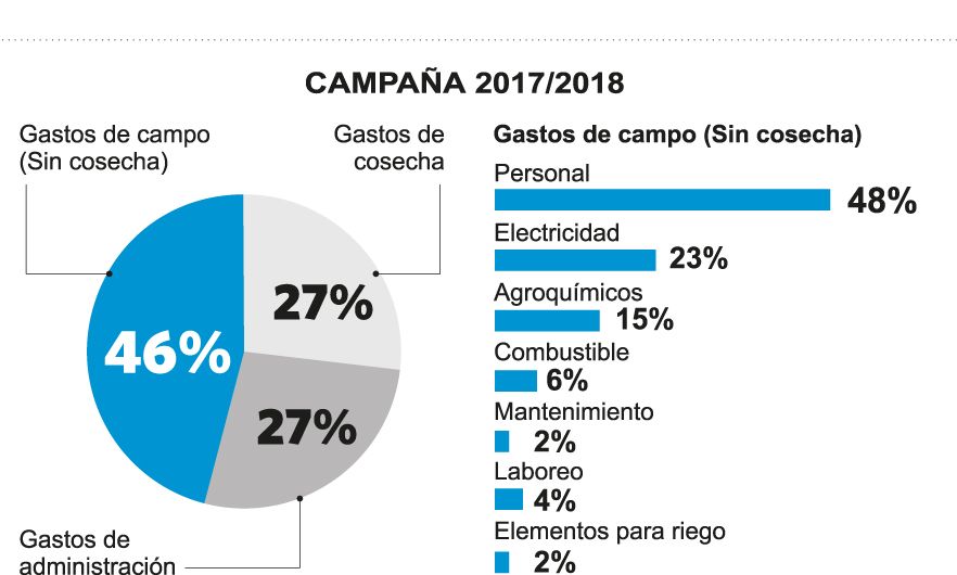 Como se puede ver a la izquierda del gráfico a cinco columnas, en la temporada 2016/17, los gastos de electricidad rondaban el 13% y en la siguiente, el valor comparativo pasó al 23%. Los otros ítems de la torta también se modificaron.