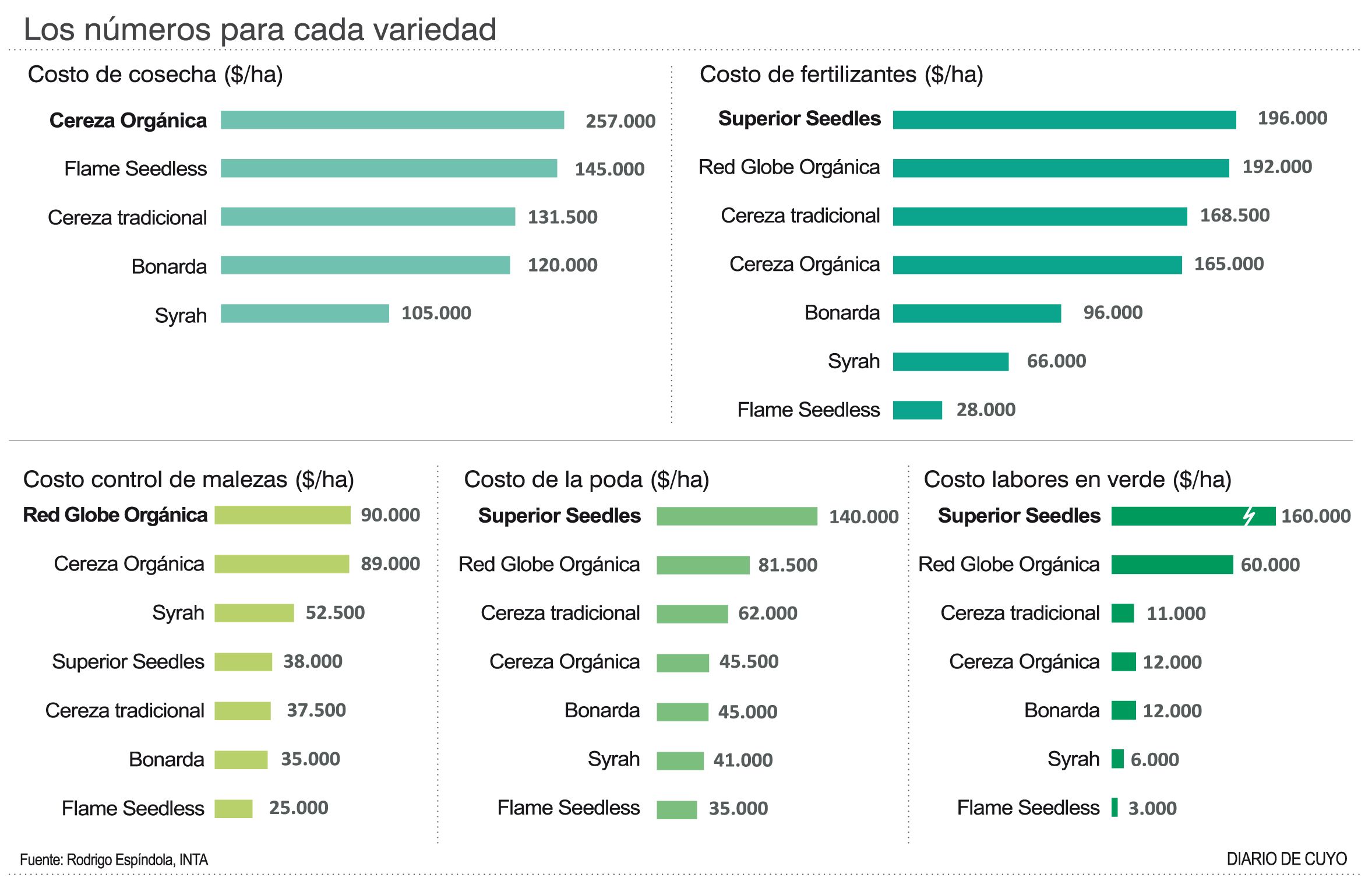 Sigue liderando la Superior Seedless, con $160.000; mucho jornal lleva. Una Red Globe pero del tipo orgánica, está sobre los $60.000, gran diferencia con la anterior. Y mucho menos para el resto de los varietales que integran este estudio, y registro de base científica del INTA: Cereza común $11.000; Cereza manejado de manera orgánica $12.000; Bonarda algo similar en números al anterior. Syrah baja a $6.000 y un parral de Flame Seedless llega a sólo $3.000.