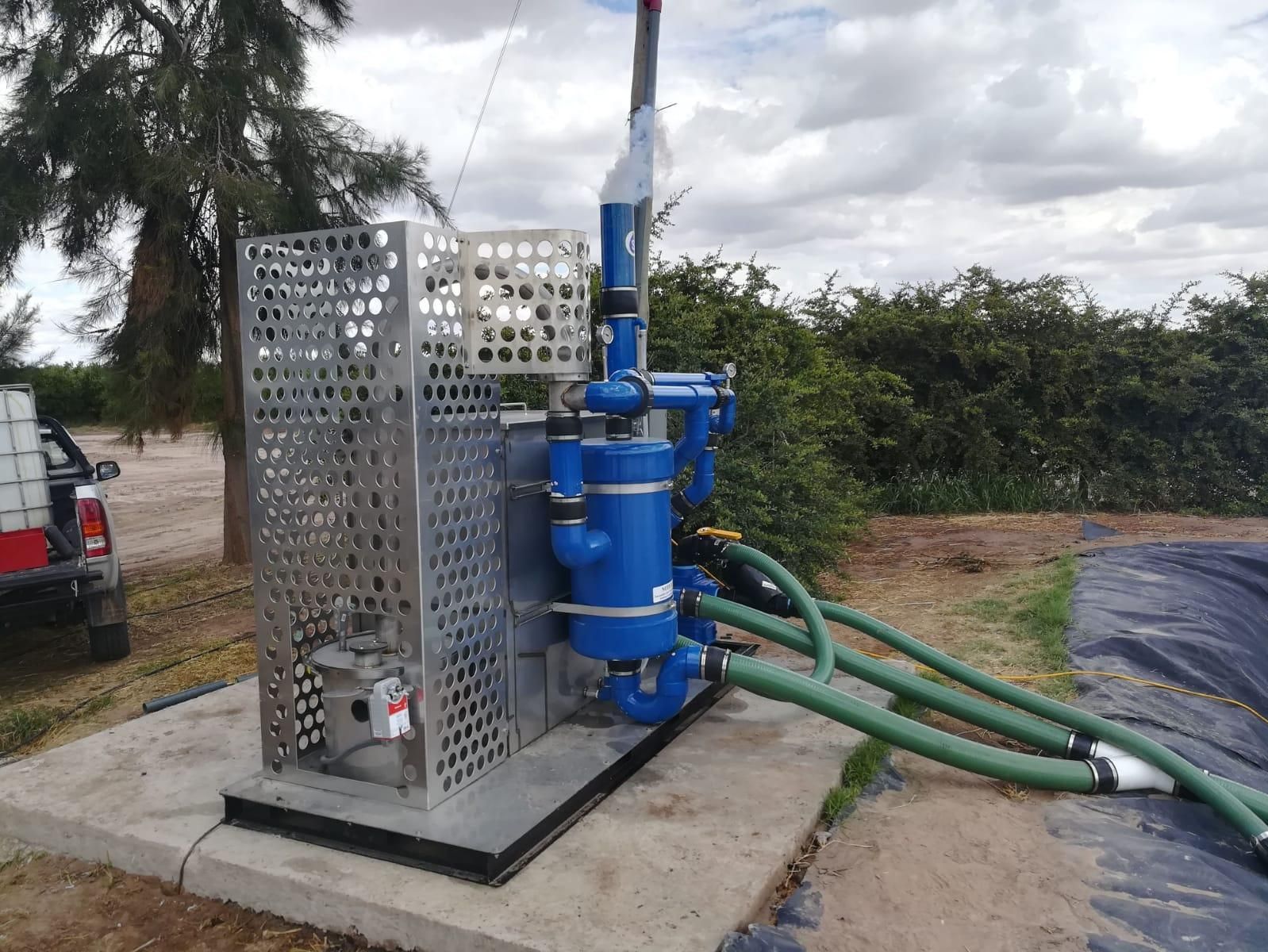 "Nosotros tenemos una propuesta, que denominamos "Agua Dulce de Crisopa SRL", en el que el sistema se basa en la quema de azufre en escamas de alta pureza, que produce dióxido de azufre (anhídrido sulfuroso). Este gas condensa y se mezcla con el agua a través del sistema de doble venturi formando ácido sulfuroso. A partir de este ácido sulfuroso que forma la máquina, es que se trata el agua de riego de dos maneras: 1) Por inyección de ácido sulfuroso al reservorio, con esto se trata el agua acumulada en el mismo y de ahí se riegan los cultivos con el pH corregido. Luego se quema azufre a medida que el reservorio se recarga para mantener acidificada el agua. y 2) Por inyección directa al sistema de riego, dependiendo del caudal se inyecta directamente en la cañería primaria del riego una fracción de este ácido para corregir pH y de ahí distribuir hacia los cultivos".