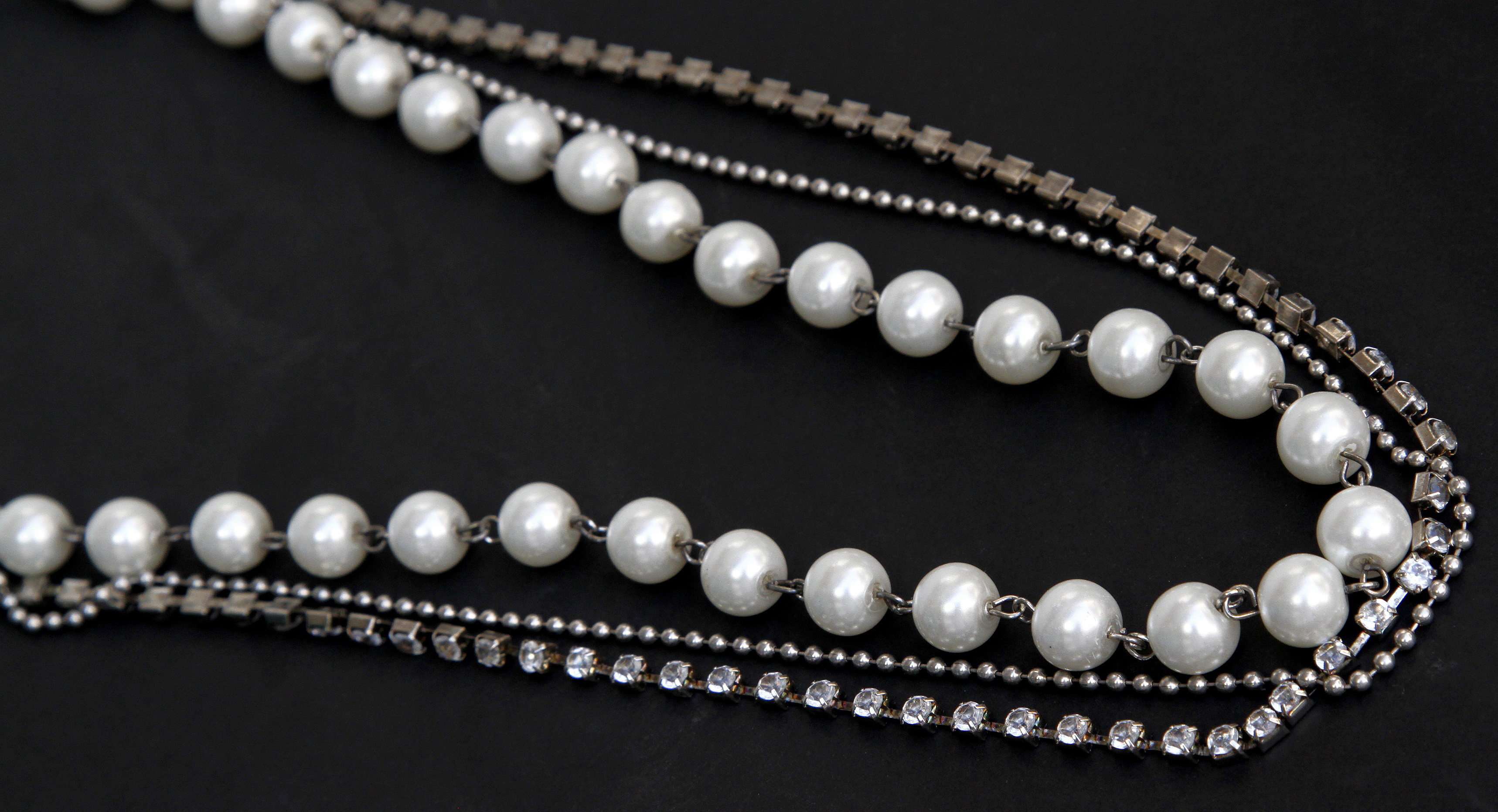 COLLAR DE TRES VUELTAS DE PERLAS, CADENAS Y STRASS ($490).