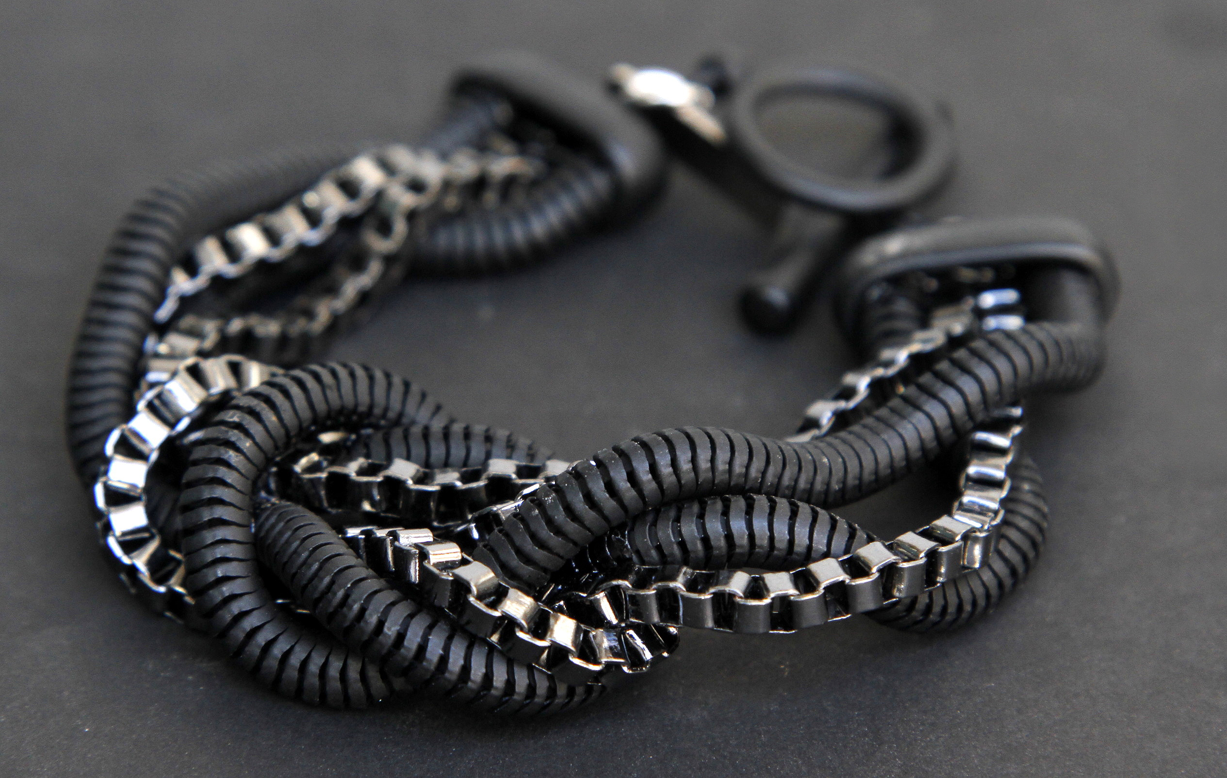 PULSERA DE METAL Y COLA DE RATÓN PINTADA ($150).