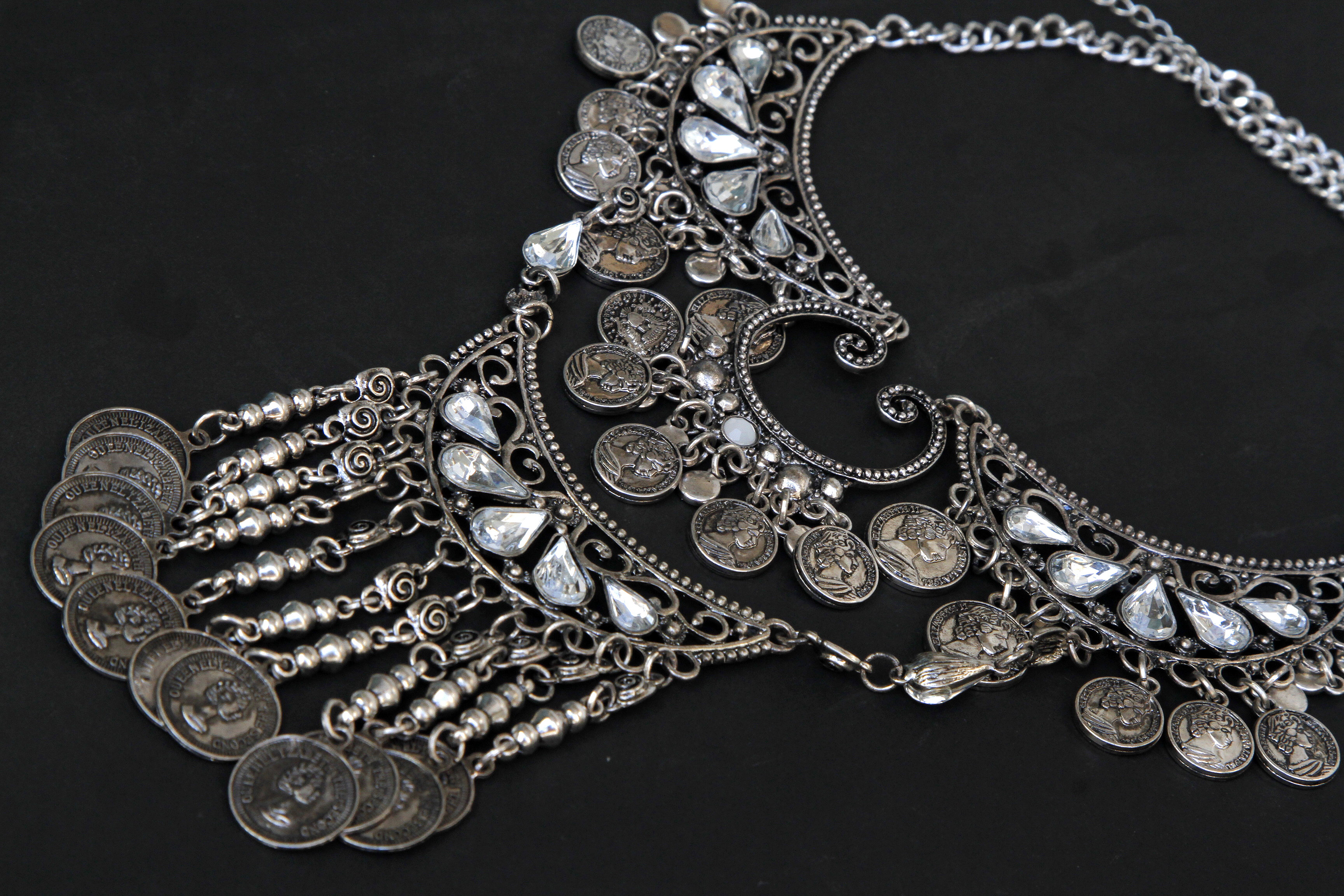 Collar con piezas colgantes y strass, cadenas y monedas ($450)